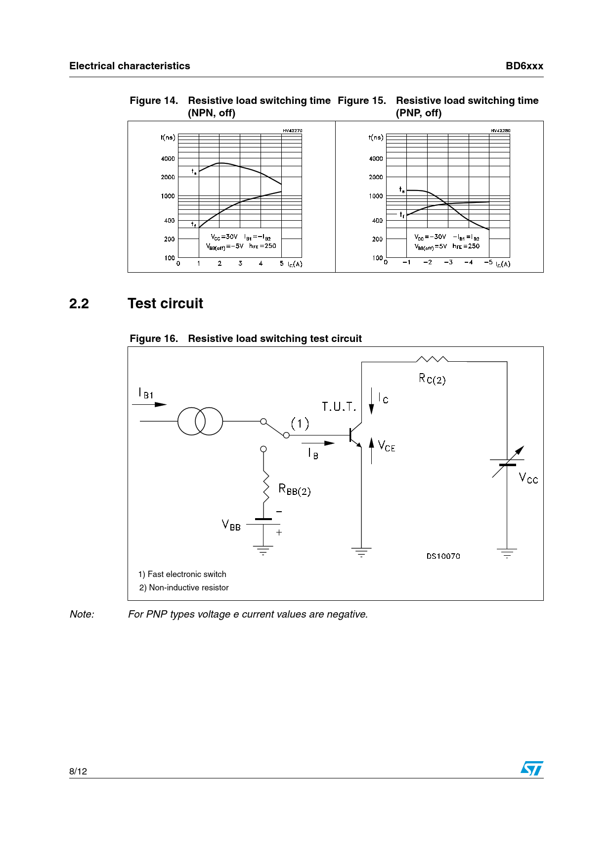 Electrical characteristicsBD6xxxFigure 14.Resistive load switching time Figure 15.Resistive load switching time(NPN, off)(PNP, off)2.2 TestcircuitFigure 16.Resistive load switching test circuit 1) Fast electronic switch 2) Non-inductive resistor Note: For PNP types voltage e current values are negative. 8/12 Document Outline Figure 1. Internal schematic diagram Table 1. Device summary 1 Absolute maximum ratings Table 2. Absolute maximum ratings 2 Electrical characteristics Table 3. Electrical characteristics 2.1 Typical characteristic (curves) Figure 2. DC current gain (NPN) Figure 3. DC current gain (PNP) Figure 4. DC current gain (NPN) Figure 5. DC current gain (PNP) Figure 6. Collector-emitter saturation voltage (NPN) Figure 7. Collector-emitter saturation voltage (PNP) Figure 8. Base-emitter saturation voltage (NPN) Figure 9. Base-emitter saturation voltage (PNP) Figure 10. Base-emitter voltage (NPN) Figure 11. Base-emitter voltage (PNP) Figure 12. Resistive load switching time (NPN, on) Figure 13. Resistive load switching time (PNP, on) Figure 14. Resistive load switching time (NPN, off) Figure 15. Resistive load switching time (PNP, off) 2.2 Test circuit Figure 16. Resistive load switching test circuit 3 Package mechanical data 4 Revision history Table 4. Document revision history