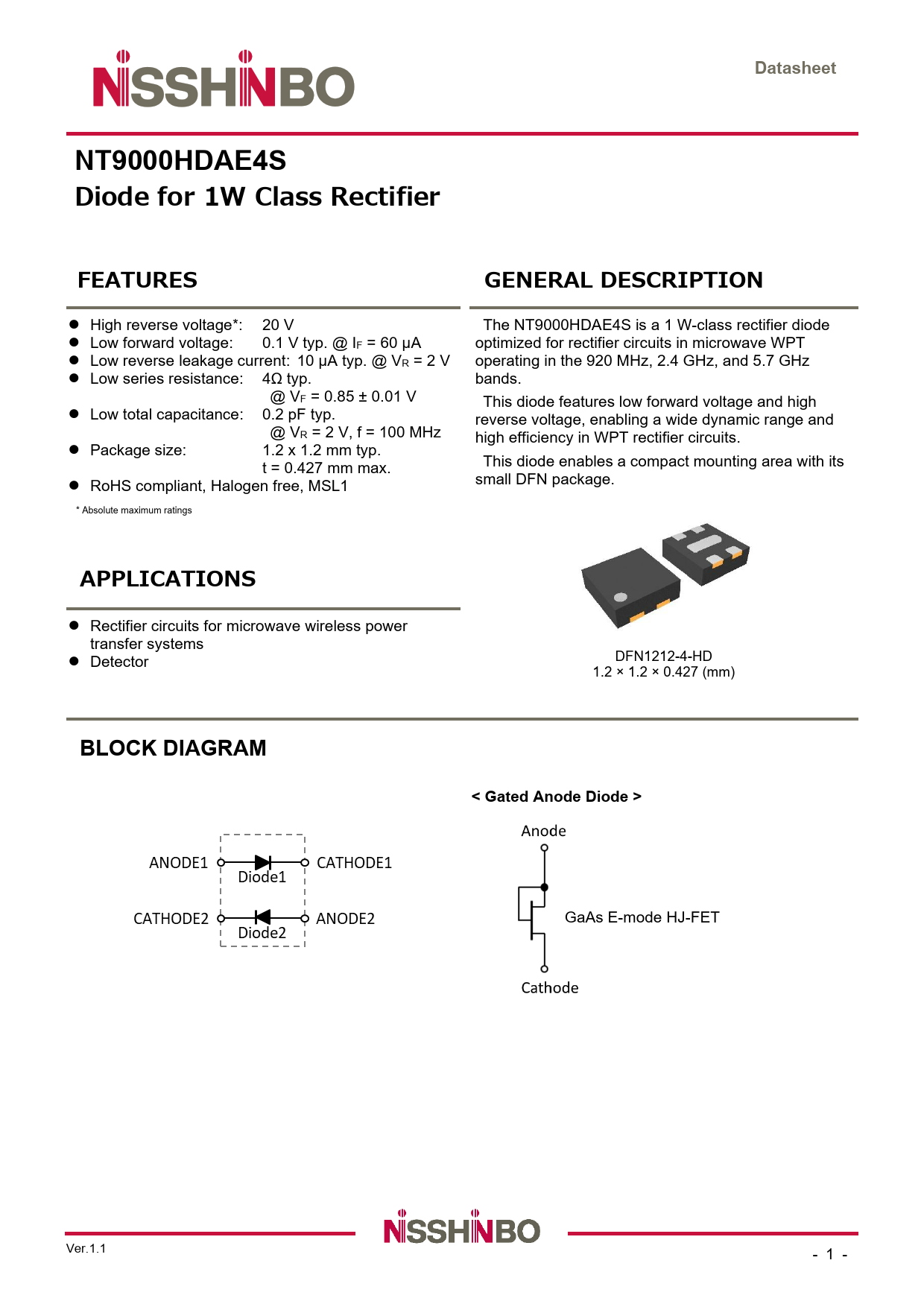Datasheet. NT9000HDAE4S. Diode for 1W Class Rectifier. FEATURES. GENERAL DESCRIPTION. APPLICATIONS. BLOCK DIAGRAM