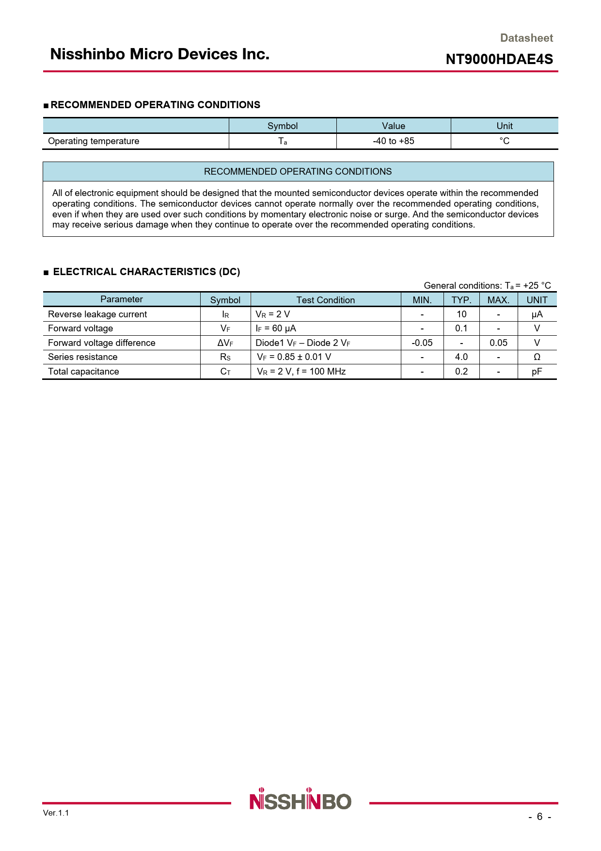 General conditions: Ta = +25 °C Parameter Symbol Test Condition MIN. TYP. MAX. UNIT Reverse leakage current IR VR = 2 V - 10 - µA Forward voltage VF IF = 60 µA - 0.1 - V Forward voltage difference ΔVF Diode1 VF – Diode 2 VF -0.05 - 0.05 V Series resistance RS VF = 0.85 ± 0.01 V - 4.0 - Ω Total capacitance CT VR = 2 V, f = 100 MHz - 0.2 - pF Ver.1.1 - 6 - Document Outline FEATURES GENERAL DESCRIPTION APPLICATIONS BLOCK DIAGRAM ■ PRODUCT NAME INFORMATION ■ ORDER INFORMATION ■ PIN DESCRIPTIONS ■ ABSOLUTE MAXIMUM RATINGS ■ THERMAL CHARACTERISTICS ■ ELECTROSTATIC DISCHARGE RATINGS ■ RECOMMENDED OPERATING CONDITIONS ■ ELECTRICAL CHARACTERISTICS (DC) ■ TYPICAL CHARACTERISTICS ■ SPICE MODEL ● Notes on Using the SPICE Model ■ MARKING SPECIFICATION ■ REVISION HISTORY PACKAGE INFORMATION CAUTION