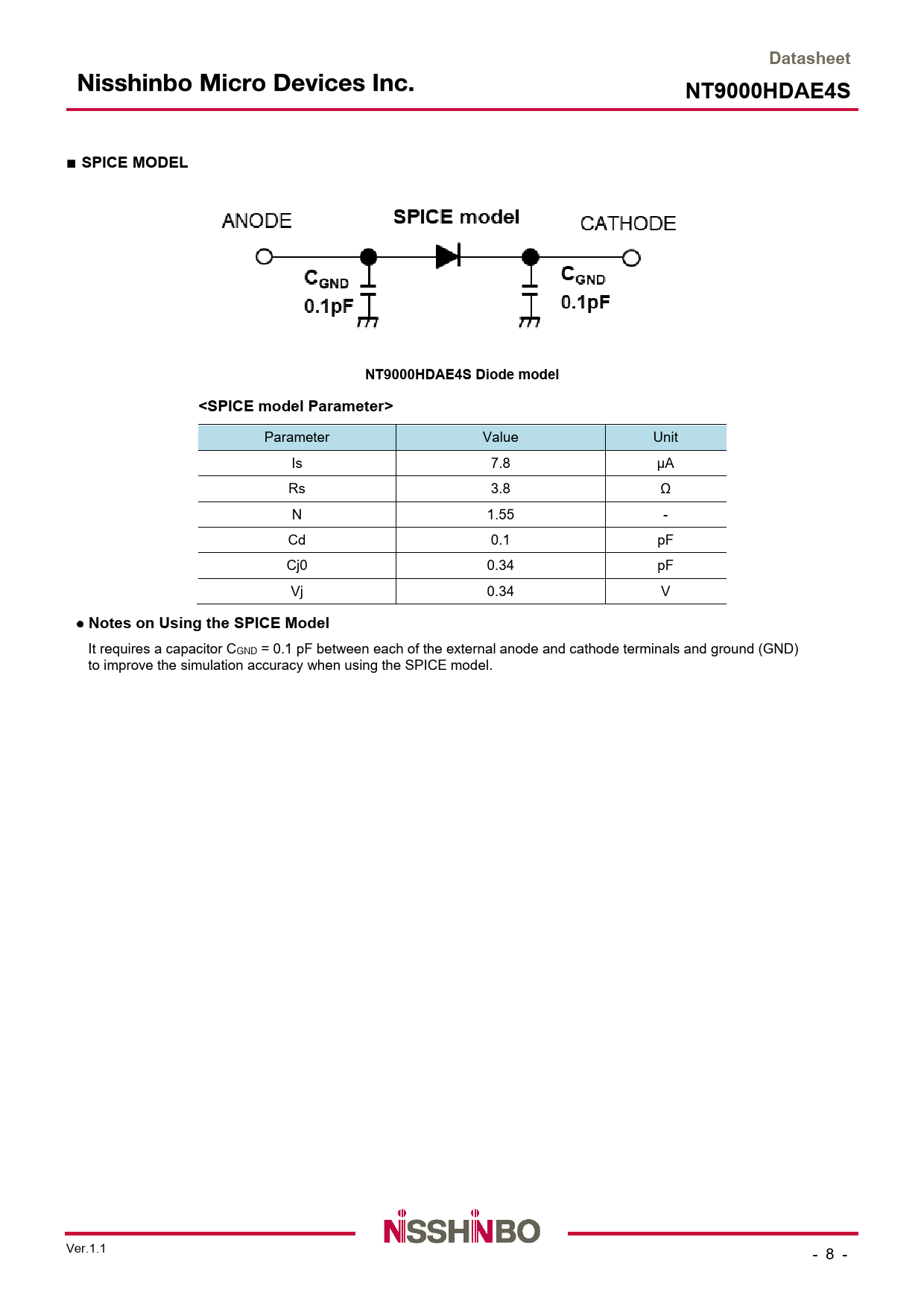DatasheetNT9000HDAE4S■ SPICE MODELNT9000HDAE4S Diode model<SPICE model Parameter> Parameter Value Unit Is 7.8 μA Rs 3.8 Ω N 1.55 - Cd 0.1 pF Cj0 0.34 pF Vj 0.34 V Notes on Using the SPICE Model It requires a capacitor CGND = 0.1 pF between each of the external anode and cathode terminals and ground (GND) to improve the simulation accuracy when using the SPICE model. Ver.1.1 - 8 - Document Outline FEATURES GENERAL DESCRIPTION APPLICATIONS BLOCK DIAGRAM ■ PRODUCT NAME INFORMATION ■ ORDER INFORMATION ■ PIN DESCRIPTIONS ■ ABSOLUTE MAXIMUM RATINGS ■ THERMAL CHARACTERISTICS ■ ELECTROSTATIC DISCHARGE RATINGS ■ RECOMMENDED OPERATING CONDITIONS ■ ELECTRICAL CHARACTERISTICS (DC) ■ TYPICAL CHARACTERISTICS ■ SPICE MODEL ● Notes on Using the SPICE Model ■ MARKING SPECIFICATION ■ REVISION HISTORY PACKAGE INFORMATION CAUTION