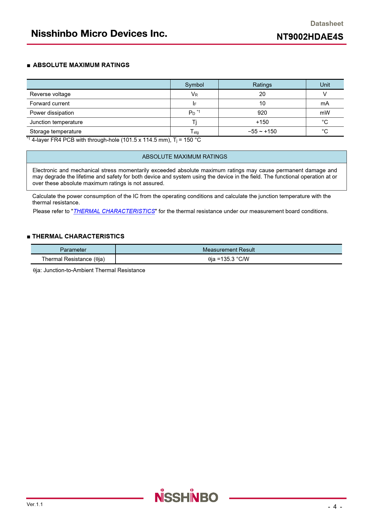 link to page 4 DatasheetNT9002HDAE4S■ ABSOLUTE MAXIMUM RATINGS Symbol Ratings Unit Reverse voltage VR 20 V Forward current IF 10 mA Power dissipation PD *1 920 mW Junction temperature Tj +150 °C Storage temperature Tstg −55 ~ +150 °C *1 4-layer FR4 PCB with through-hole (101.5 x 114.5 mm), Tj = 150 °C ABSOLUTE MAXIMUM RATINGS Electronic and mechanical stress momentarily exceeded absolute maximum ratings may cause permanent damage and may degrade the lifetime and safety for both device and system using the device in the field. The functional operation at or over these absolute maximum ratings is not assured. Calculate the power consumption of the IC from the operating conditions and calculate the junction temperature with the thermal resistance. Please refer to "THERMAL CHARACTERISTICS" for the thermal resistance under our measurement board conditions. ■ THERMAL CHARACTERISTICS Parameter Measurement Result Thermal Resistance (ja) ja =135.3 °C/W ja: Junction-to-Ambient Thermal Resistance Ver.1.1 - 4 - Document Outline FEATURES GENERAL DESCRIPTION APPLICATIONS BLOCK DIAGRAM ■ PRODUCT NAME INFORMATION ■ ORDER INFORMATION ■ PIN DESCRIPTIONS ■ ABSOLUTE MAXIMUM RATINGS ■ THERMAL CHARACTERISTICS ■ ELECTROSTATIC DISCHARGE RATINGS ■ RECOMMENDED OPERATING CONDITIONS ■ ELECTRICAL CHARACTERISTICS (DC) ■ TYPICAL CHARACTERISTICS ■ SPICE MODEL ● Notes on Using the SPICE Model ■ MARKING SPECIFICATION ■ REVISION HISTORY PACKAGE INFORMATION CAUTION