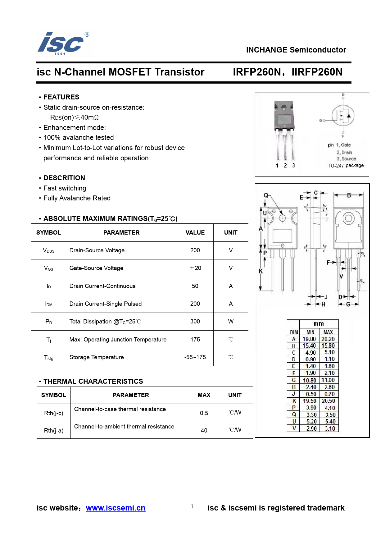 INCHANGE Semiconductor. isc N-Channel MOSFET Transistor. IRFP260N. I RFP260N. FEATURES. DESCRITION. ABSOLUTE MAXIMUM RATINGS(Ta=25