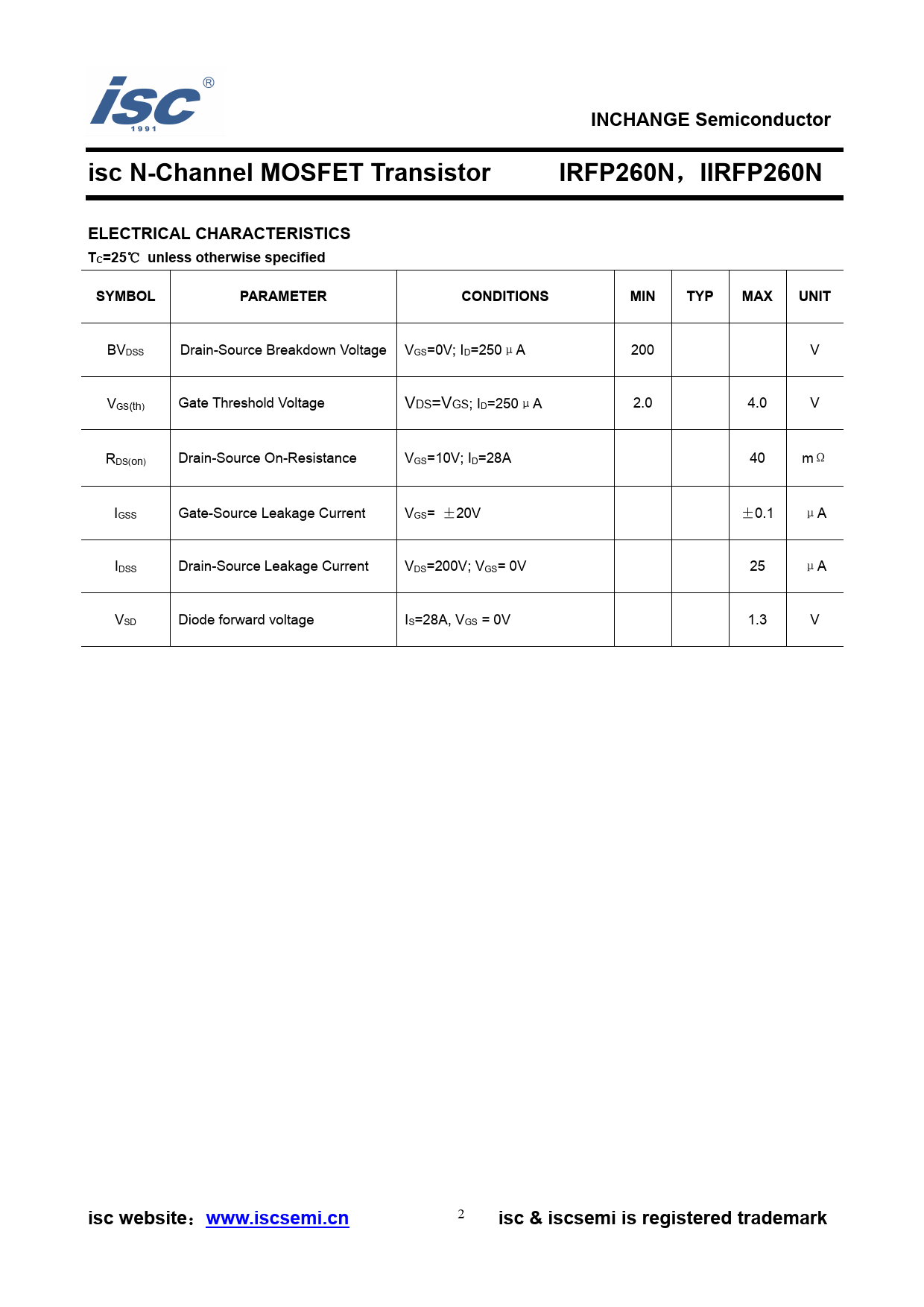 INCHANGE Semiconductor. isc N-Channel MOSFET Transistor. IRFP260N. I RFP260N. ELECTRICAL CHARACTERISTICS TC=25
