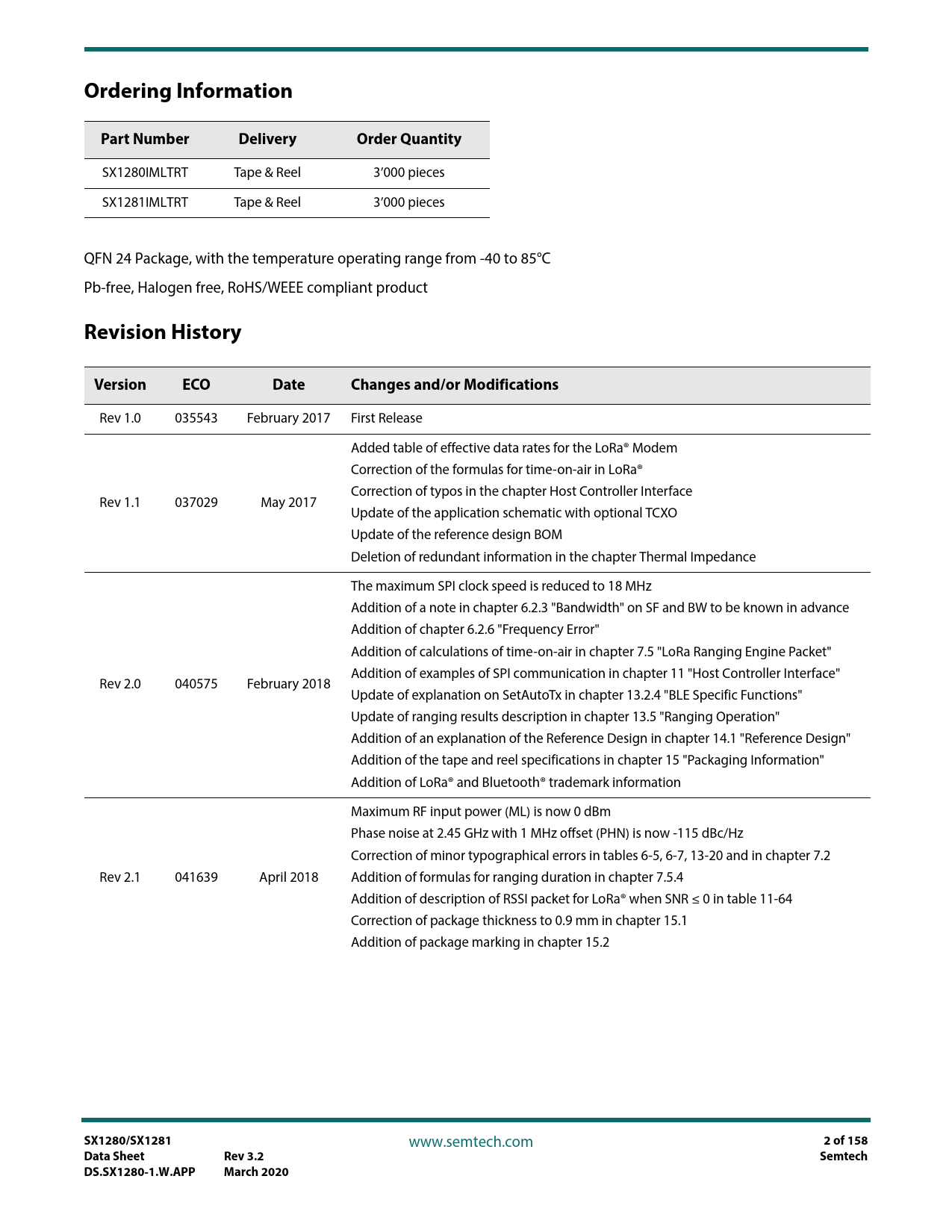 link to page 158 Ordering InformationPart NumberDeliveryOrder Quantity SX1280IMLTRT Tape & Reel 3’000 pieces SX1281IMLTRT Tape & Reel 3’000 pieces QFN 24 Package, with the temperature operating range from -40 to 85°C Pb-free, Halogen free, RoHS/WEEE compliant product Revision HistoryVersionECODateChanges and/or Modifications Rev 1.0 035543 February 2017 First Release Added table of effective data rates for the LoRa® Modem Correction of the formulas for time-on-air in LoRa® Correction of typos in the chapter Host Controller Interface Rev 1.1 037029 May 2017 Update of the application schematic with optional TCXO Update of the reference design BOM Deletion of redundant information in the chapter Thermal Impedance The maximum SPI clock speed is reduced to 18 MHz Addition of a note in chapter 6.2.3 "Bandwidth" on SF and BW to be known in advance Addition of chapter 6.2.6 "Frequency Error" Addition of calculations of time-on-air in chapter 7.5 "LoRa Ranging Engine Packet" Addition of examples of SPI communication in chapter 11 "Host Controller Interface" Rev 2.0 040575 February 2018 Update of explanation on SetAutoTx in chapter 13.2.4 "BLE Specific Functions" Update of ranging results description in chapter 13.5 "Ranging Operation" Addition of an explanation of the Reference Design in chapter 14.1 "Reference Design" Addition of the tape and reel specifications in chapter 15 "Packaging Information" Addition of LoRa® and Bluetooth® trademark information Maximum RF input power (ML) is now 0 dBm Phase noise at 2.45 GHz with 1 MHz offset (PHN) is now -115 dBc/Hz Correction of minor typographical errors in tables 6-5, 6-7, 13-20 and in chapter 7.2 Rev 2.1 041639 April 2018 Addition of formulas for ranging duration in chapter 7.5.4 Addition of description of RSSI packet for LoRa® when SNR ≤ 0 in table 11-64 Correction of package thickness to 0.9 mm in chapter 15.1 Addition of package marking in chapter 15.2 SX1280/SX1281 www.semtech.com 2 of 158Data SheetRev 3.2SemtechDS.SX1280-1.W.APPMarch 2020 Document Outline Table of Contents List of Figures List of Tables 1. Introduction 1.1 Analog Front End 1.2 Power Distribution 1.3 Modem 1.4 Packet Processing 1.5 Digital Interface and Control 2. Pin Connections 2.1 Transceiver Pinout 2.2 Package view 3. Specifications 3.1 ESD Notice 3.2 Absolute Minimum and Maximum Ratings 3.3 Operating Range 3.4 General Electrical Specifications 3.5 Receiver Electrical Specifications 3.5.1 Receiver Specifications 3.5.2 LoRa® Modem 3.5.3 FLRC Modem 3.5.4 FSK Modem 3.6 Transmitter Electrical Specifications 3.7 Crystal Oscillator Specifications 3.8 Digital Pin Levels 4. Analog Front End 4.1 Transmitter 4.2 Receiver 4.2.1 Low Power Mode and High Sensitivity Mode 4.2.2 Image Frequency 4.2.3 Wi-Fi and Bluetooth Immunity 4.3 PLL 4.4 RC Oscillators 5. Power Distribution 5.1 Selecting DC-DC Converter or LDO Regulation 5.2 Flexible DIO Supply 6. Digital Baseband 6.1 Overview 6.2 LoRa® Modem 6.2.1 LoRa® Modulation 6.2.2 Spreading Factor 6.2.3 Bandwidth 6.2.4 Forward Error Correction Coding Rate 6.2.5 Ranging Engine 6.2.6 Advanced Ranging 6.2.7 Frequency Error 6.3 FLRC Modem 6.3.1 Modem Bandwidth and Data Rates 6.3.2 FEC Coding Rate 6.3.3 Gaussian Filtering 6.4 FSK Modem 6.4.1 Modem Bandwidth and Data Rates 6.4.2 Modem Modulation Index 6.5 Guidance on Modem Selection 7. Packet Engine 7.1 GFSK Packet 7.1.1 Fixed-length Packet Format 7.1.2 Variable-length Packet Format 7.2 BLE Packet Format 7.3 FLRC Packet 7.3.1 FLRC Packet Format 7.3.2 Fixed-Length Packet Format 7.3.3 Variable-length Packet Format 7.3.4 FLRC Time-on-Air 7.4 LoRa® Packet 7.4.1 LoRa® Packet Format 7.4.2 Explicit (Variable-length) Header Mode 7.4.3 Implicit (Fixed-length) Header Mode 7.4.4 LoRa® Time-on-Air 7.5 LoRa® Ranging Engine Packet 7.5.1 Ranging Packet Format 7.5.2 Ranging Master Exchange 7.5.3 Ranging Slave Exchange 7.5.4 Total Exchange Duration 7.5.5 Measurement 8. Data Buffer 8.1 Principle of Operation 8.2 Receive Operation 8.3 Transmit Operation 8.4 Using the Data buffer 9. Digital Interface and Control 9.1 BUSY Pin Communication 9.2 Interface Detection 9.3 SPI Interface 9.3.1 SPI Timing 9.3.2 SPI Timing When the Transceiver is in Active Mode 9.3.3 SPI Timing When the Transceiver Leaves Sleep Mode 9.4 UART Interface 9.4.1 Default UART Settings 9.4.2 Setting the UART Speed 9.5 Pin Sharing 9.6 Multi-Purpose Digital Input/Output (DIO) 9.7 Transceiver Initialization on a Shared SPI Bus 10. Operational Modes 10.1 Startup 10.2 Sleep Mode 10.3 Standby Mode 10.4 Frequency Synthesis (FS) Mode 10.5 Receive (Rx) Mode 10.6 Transmit (Tx) Mode 10.7 Transceiver Circuit Modes Graphical Illustration 10.8 Active Mode Switching Time 11. Host Controller Interface 11.1 Command Structure 11.2 SetUartSpeed Command 11.3 GetStatus Command 11.4 Register Access Operations 11.4.1 WriteRegister Command 11.4.2 ReadRegister Command 11.5 Data Buffer Operations 11.5.1 WriteBuffer Command 11.5.2 ReadBuffer 11.6 Radio Operation Modes 11.6.1 SetSleep 11.6.2 SetStandby 11.6.3 SetFs 11.6.4 SetTx 11.6.5 SetRx 11.6.6 SetRxDutyCycle 11.6.7 SetLongPreamble 11.6.8 SetCAD 11.6.9 SetTxContinuousWave 11.6.10 SetTxContinuousPreamble 11.6.11 SetAutoTx 11.6.12 SetAutoFs 11.7 Radio Configuration 11.7.1 SetPacketType 11.7.2 GetPacketType 11.7.3 SetRfFrequency 11.7.4 SetTxParams 11.7.5 SetCadParams 11.7.6 SetBufferBaseAddress 11.7.7 SetModulationParams 11.7.8 SetPacketParams 11.8 Communication Status Information 11.8.1 GetRxBufferStatus 11.8.2 GetPacketStatus 11.8.3 GetRssiInst 11.9 IRQ Handling 11.9.1 SetDioIrqParams 11.9.2 GetIrqStatus 11.9.3 ClearIrqStatus 12. List of Commands 13. Register Map 14. Transceiver Operation 14.1 GFSK Operation 14.1.1 Common Transceiver Settings 14.1.2 Tx Setting and Operations 14.1.3 Rx Setting and Operations 14.2 BLE Operation 14.2.1 Common Transceiver Settings 14.2.2 Tx Setting and Operations 14.2.3 Rx Setting and Operations 14.2.4 BLE Specific Functions 14.3 FLRC Operation 14.3.1 Common Transceiver Settings 14.