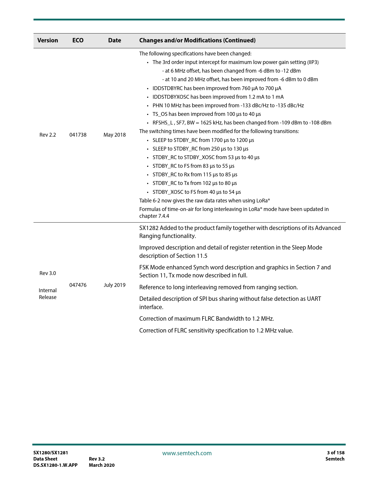 The following specifications have been changed: • The 3rd order input intercept for maximum low power gain setting (IIP3) - at 6 MHz offset, has been changed from -6 dBm to -12 dBm - at 10 and 20 MHz offset, has been improved from -6 dBm to 0 dBm • IDDSTDBYRC has been improved from 760 μA to 700 μA • IDDSTDBYXOSC has been improved from 1.2 mA to 1 mA • PHN 10 MHz has been improved from -133 dBc/Hz to -135 dBc/Hz • TS_OS has been improved from 100 μs to 40 μs • RFSHS_L , SF7, BW = 1625 kHz, has been changed from -109 dBm to -108 dBm The switching times have been modified for the following transitions: Rev 2.2 041738 May 2018 • SLEEP to STDBY_RC from 1700 μs to 1200 μs • SLEEP to STDBY_RC from 250 μs to 130 μs • STDBY_RC to STDBY_XOSC from 53 μs to 40 μs • STDBY_RC to FS from 83 μs to 55 μs • STDBY_RC to Rx from 115 μs to 85 μs • STDBY_RC to Tx from 102 μs to 80 μs • STDBY_XOSC to FS from 40 μs to 54 μs Table 6-2 now gives the raw data rates when using LoRa® Formulas of time-on-air for long interleaving in LoRa® mode have been updated in chapter 7.4.4 SX1282 Added to the product family together with descriptions of its Advanced Ranging functionality. Improved description and detail of register retention in the Sleep Mode description of Section 11.5 FSK Mode enhanced Synch word description and graphics in Section 7 and Rev 3.0 Section 11, Tx mode now described in full. 047476 July 2019 Reference to long interleaving removed from ranging section. Internal Release Detailed description of SPI bus sharing without false detection as UART interface. Correction of maximum FLRC Bandwidth to 1.2 MHz. Correction of FLRC sensitivity specification to 1.2 MHz value.