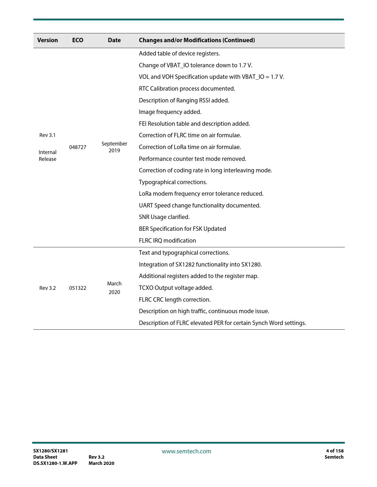 Version. ECO. Date. Changes and/or Modifications (Continued). SX1280/SX1281. 4 of 158. Data Sheet. Rev 3.2. Semtech. DS.SX1280-1.W.APP