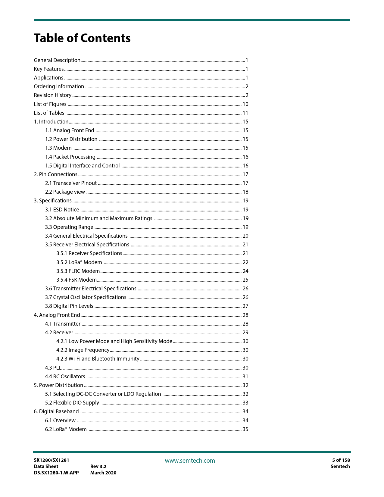 link to page 1 link to page 15 link to page 1 link to page 1 link to page 2 link to page 2 link to page 10 link to page 11 link to page 15 link to page 15 link to page 15 link to page 15 link to page 16 link to page 16 link to page 17 link to page 17 link to page 18 link to page 19 link to page 19 link to page 19 link to page 19 link to page 20 link to page 21 link to page 21 link to page 22 link to page 24 link to page 25 link to page 26 link to page 26 link to page 27 link to page 28 link to page 28 link to page 29 link to page 30 link to page 30 link to page 30 link to page 30 link to page 31 link to page 32 link to page 32 link to page 33 link to page 34 link to page 34 link to page 35 link to page 158 Table of Contents General Description...1 Key Features...1 Applications ...1 Ordering Information ...2 Revision History ..2 List of Figures ... 10 List of Tables .. 11 1. Introduction.. 15 1.1 Analog Front End ... 15 1.2 Power Distribution .. 15 1.3 Modem .. 15 1.4 Packet Processing .. 16 1.5 Digital Interface and Control ... 16 2. Pin Connections .. 17 2.1 Transceiver Pinout ... 17 2.2 Package view ... 18 3. Specifications ... 19 3.1 ESD Notice .. 19 3.2 Absolute Minimum and Maximum Ratings ... 19 3.3 Operating Range .. 19 3.4 General Electrical Specifications .. 20 3.5 Receiver Electrical Specifications ... 21 3.5.1 Receiver Specifications.. 21 3.5.2 LoRa® Modem .. 22 3.5.3 FLRC Modem... 24 3.5.4 FSK Modem.. 25 3.6 Transmitter Electrical Specifications ... 26 3.7 Crystal Oscillator Specifications ... 26 3.8 Digital Pin Levels .. 27 4. Analog Front End.. 28 4.1 Transmitter ... 28 4.2 Receiver ... 29 4.2.1 Low Power Mode and High Sensitivity Mode... 30 4.2.2 Image Frequency... 30 4.2.3 Wi-Fi and Bluetooth Immunity ... 30 4.3 PLL ... 30 4.4 RC Oscillators .. 31 5. Power Distribution ... 32 5.1 Selecting DC-DC Converter or LDO Regulation ... 32 5.2 Flexible DIO Supply .. 33 6. Digital Baseband... 34 6.1 Overview ... 34 6.2 LoRa® Modem ... 35 SX1280/SX1281 www.semtech.com 5 of 158Data SheetRev 3.2SemtechDS.SX1280-1.W.APPMarch 2020 Document Outline Table of Contents List of Figures List of Tables 1. Introduction 1.1 Analog Front End 1.2 Power Distribution 1.3 Modem 1.4 Packet Processing 1.5 Digital Interface and Control 2. Pin Connections 2.1 Transceiver Pinout 2.2 Package view 3. Specifications 3.1 ESD Notice 3.2 Absolute Minimum and Maximum Ratings 3.3 Operating Range 3.4 General Electrical Specifications 3.5 Receiver Electrical Specifications 3.5.1 Receiver Specifications 3.5.2 LoRa® Modem 3.5.3 FLRC Modem 3.5.4 FSK Modem 3.6 Transmitter Electrical Specifications 3.7 Crystal Oscillator Specifications 3.8 Digital Pin Levels 4. Analog Front End 4.1 Transmitter 4.2 Receiver 4.2.1 Low Power Mode and High Sensitivity Mode 4.2.2 Image Frequency 4.2.3 Wi-Fi and Bluetooth Immunity 4.3 PLL 4.4 RC Oscillators 5. Power Distribution 5.1 Selecting DC-DC Converter or LDO Regulation 5.2 Flexible DIO Supply 6. Digital Baseband 6.1 Overview 6.2 LoRa® Modem 6.2.1 LoRa® Modulation 6.2.2 Spreading Factor 6.2.3 Bandwidth 6.2.4 Forward Error Correction Coding Rate 6.2.5 Ranging Engine 6.2.6 Advanced Ranging 6.2.7 Frequency Error 6.3 FLRC Modem 6.3.1 Modem Bandwidth and Data Rates 6.3.2 FEC Coding Rate 6.3.3 Gaussian Filtering 6.4 FSK Modem 6.4.1 Modem Bandwidth and Data Rates 6.4.2 Modem Modulation Index 6.5 Guidance on Modem Selection 7. Packet Engine 7.1 GFSK Packet 7.1.1 Fixed-length Packet Format 7.1.2 Variable-length Packet Format 7.2 BLE Packet Format 7.3 FLRC Packet 7.3.1 FLRC Packet Format 7.3.2 Fixed-Length Packet Format 7.3.3 Variable-length Packet Format 7.3.4 FLRC Time-on-Air 7.4 LoRa® Packet 7.4.1 LoRa® Packet Format 7.4.2 Explicit (Variable-length) Header Mode 7.4.3 Implicit (Fixed-length) Header Mode 7.4.4 LoRa® Time-on-Air 7.5 LoRa® Ranging Engine Packet 7.5.1 Ranging Packet Format 7.5.2 Ranging Master Exchange 7.5.3 Ranging Slave Exchange 7.5.4 Total Exchange Duration 7.5.5 Measurement 8. Data Buffer 8.1 Principle of Operation 8.2 Receive Operation 8.3 Transmit Operation 8.4 Using the Data buffer 9. Digital Interface and Control 9.1 BUSY Pin Communication 9.2 Interface Detection 9.3 SPI Interface 9.3.1 SPI Timing 9.3.2 SPI Timing When the Transceiver is in Active Mode 9.3.3 SPI Timing When the Transceiver Leaves Sleep Mode 9.4 UART Interface 9.4.1 Default UART Settings 9.4.2 Setting the UART Speed 9.5 Pin Sharing 9.6 Multi-Purpose Digital Input/Output (DIO) 9.7 Transceiver Initialization on a Shared SPI Bus 10. Operational Modes 10.1 Startup 10.2 Sleep Mode 10.3 Standby Mode 10.4 Frequency Synthesis (FS) Mode 10.5 Receive (Rx) Mode 10.6 Transmit (Tx) Mode 10.7 Transceiver Circuit Modes Graphical Illustration 10.8 Active Mode Switching Time 11. Host Controller Interface 11.1 Command Structure 11.2 SetUartSpeed Command 11.3 GetStatus Command 11.4 Register Access Operations 11.4.1 WriteRegister Command 11.4.2 ReadRegister Command 11.5 Data Buffer Operations 11.5.1 WriteBuffer Command 11.5.2 ReadBuffer 11.6 Radio Operation Modes 11.6.1 SetSleep 11.6.2 SetStandby 11.6.3 SetFs 11.6.4 SetTx 11.6.5 SetRx 11.6.6 SetRxDutyCycle 11.6.7 SetLongPreamble 11.6.8 SetCAD 11.6.9 SetTxContinuousWave 11.6.10 SetTxContinuousPreamble 11.6.11 SetAutoTx 11.6.12 SetAutoFs 11.7 Radio Configuration 11.7.1 SetPacketType 11.7.2 GetPacketType 11.7.3 SetRfFrequency 11.7.4 SetTxParams 11.7.5 SetCadParams 11.7.6 SetBufferBaseAddress 11.7.7 SetModulationParams 11.7.8 SetPacketParams 11.8 Communication Status Information 11.8.1 GetRxBufferStatus 11.8.2 GetPacketStatus 11.8.3 GetRssiInst 11.9 IRQ Handling 11.9.1 SetDioIrqParams 11.9.2 GetIrqStatus 11.9.3 ClearIrqStatus 12. List of Commands 13. Register Map 14. Transceiver Operation 14.1 GFSK Operation 14.1.1 Common Transceiver Settings 14.1.2 Tx Setting and Operations 14.1.3 Rx Setting and Operations 14.2 BLE Operation 14.2.1 Common Transceiver Settings 14.2.2 Tx Setting and Operations 14.2.3 Rx Setting and Operations 14.2.4 BLE Specific Functions 14.3 FLRC Operation 