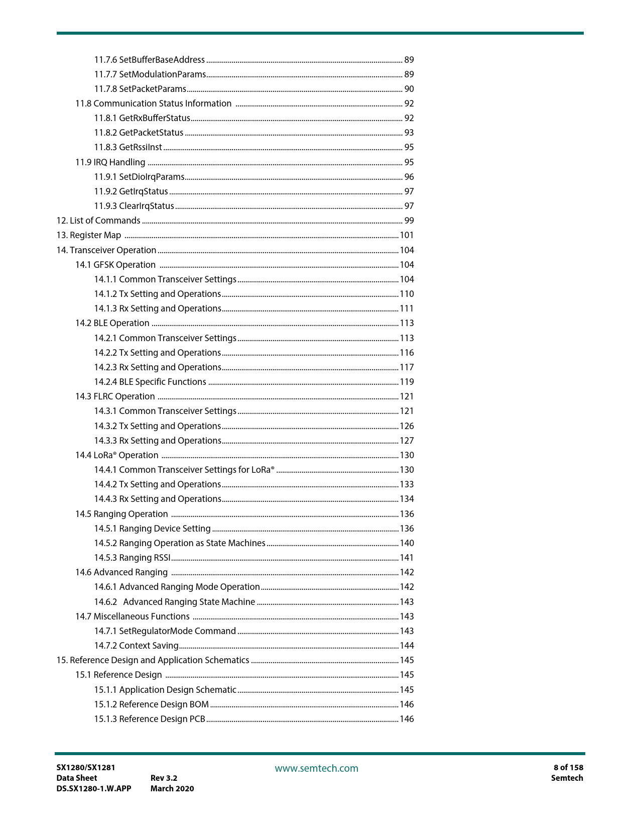 link to page 89 link to page 89 link to page 90 link to page 92 link to page 92 link to page 93 link to page 95 link to page 95 link to page 96 link to page 97 link to page 97 link to page 99 link to page 101 link to page 104 link to page 104 link to page 104 link to page 110 link to page 111 link to page 113 link to page 113 link to page 116 link to page 117 link to page 119 link to page 121 link to page 121 link to page 126 link to page 127 link to page 130 link to page 130 link to page 133 link to page 134 link to page 136 link to page 136 link to page 140 link to page 141 link to page 142 link to page 142 link to page 143 link to page 143 link to page 143 link to page 144 link to page 145 link to page 145 link to page 145 link to page 146 link to page 146 link to page 158 11.7.6 SetBufferBaseAddress ... 89 11.7.7 SetModulationParams... 89 11.7.8 SetPacketParams... 90 11.8 Communication Status Information .. 92 11.8.1 GetRxBufferStatus... 92 11.8.2 GetPacketStatus .. 93 11.8.3 GetRssiInst ... 95 11.9 IRQ Handling ... 95 11.9.1 SetDioIrqParams.. 96 11.9.2 GetIrqStatus .. 97 11.9.3 ClearIrqStatus ... 97 12. List of Commands .. 99 13. Register Map ... 101 14. Transceiver Operation .. 104 14.1 GFSK Operation ... 104 14.1.1 Common Transceiver Settings... 104 14.1.2 Tx Setting and Operations... 110 14.1.3 Rx Setting and Operations... 111 14.2 BLE Operation ... 113 14.2.1 Common Transceiver Settings... 113 14.2.2 Tx Setting and Operations... 116 14.2.3 Rx Setting and Operations... 117 14.2.4 BLE Specific Functions .. 119 14.3 FLRC Operation .. 121 14.3.1 Common Transceiver Settings... 121 14.3.2 Tx Setting and Operations... 126 14.3.3 Rx Setting and Operations... 127 14.4 LoRa® Operation .. 130 14.4.1 Common Transceiver Settings for LoRa® ... 130 14.4.2 Tx Setting and Operations... 133 14.4.3 Rx Setting and Operations... 134 14.5 Ranging Operation ... 136 14.5.1 Ranging Device Setting .. 136 14.5.2 Ranging Operation as State Machines .. 140 14.5.3 Ranging RSSI... 141 14.6 Advanced Ranging ... 142 14.6.1 Advanced Ranging Mode Operation... 142 14.6.2 Advanced Ranging State Machine ... 143 14.7 Miscellaneous Functions .. 143 14.7.1 SetRegulatorMode Command ... 143 14.7.2 Context Saving...144 15. Reference Design and Application Schematics .. 145 15.1 Reference Design .. 145 15.1.1 Application Design Schematic... 145 15.1.2 Reference Design BOM ... 146 15.1.3 Reference Design PCB ... 146 SX1280/SX1281 www.semtech.com 8 of 158Data SheetRev 3.2SemtechDS.SX1280-1.W.APPMarch 2020 Document Outline Table of Contents List of Figures List of Tables 1. Introduction 1.1 Analog Front End 1.2 Power Distribution 1.3 Modem 1.4 Packet Processing 1.5 Digital Interface and Control 2. Pin Connections 2.1 Transceiver Pinout 2.2 Package view 3. Specifications 3.1 ESD Notice 3.2 Absolute Minimum and Maximum Ratings 3.3 Operating Range 3.4 General Electrical Specifications 3.5 Receiver Electrical Specifications 3.5.1 Receiver Specifications 3.5.2 LoRa® Modem 3.5.3 FLRC Modem 3.5.4 FSK Modem 3.6 Transmitter Electrical Specifications 3.7 Crystal Oscillator Specifications 3.8 Digital Pin Levels 4. Analog Front End 4.1 Transmitter 4.2 Receiver 4.2.1 Low Power Mode and High Sensitivity Mode 4.2.2 Image Frequency 4.2.3 Wi-Fi and Bluetooth Immunity 4.3 PLL 4.4 RC Oscillators 5. Power Distribution 5.1 Selecting DC-DC Converter or LDO Regulation 5.2 Flexible DIO Supply 6. Digital Baseband 6.1 Overview 6.2 LoRa® Modem 6.2.1 LoRa® Modulation 6.2.2 Spreading Factor 6.2.3 Bandwidth 6.2.4 Forward Error Correction Coding Rate 6.2.5 Ranging Engine 6.2.6 Advanced Ranging 6.2.7 Frequency Error 6.3 FLRC Modem 6.3.1 Modem Bandwidth and Data Rates 6.3.2 FEC Coding Rate 6.3.3 Gaussian Filtering 6.4 FSK Modem 6.4.1 Modem Bandwidth and Data Rates 6.4.2 Modem Modulation Index 6.5 Guidance on Modem Selection 7. Packet Engine 7.1 GFSK Packet 7.1.1 Fixed-length Packet Format 7.1.2 Variable-length Packet Format 7.2 BLE Packet Format 7.3 FLRC Packet 7.3.1 FLRC Packet Format 7.3.2 Fixed-Length Packet Format 7.3.3 Variable-length Packet Format 7.3.4 FLRC Time-on-Air 7.4 LoRa® Packet 7.4.1 LoRa® Packet Format 7.4.2 Explicit (Variable-length) Header Mode 7.4.3 Implicit (Fixed-length) Header Mode 7.4.4 LoRa® Time-on-Air 7.5 LoRa® Ranging Engine Packet 7.5.1 Ranging Packet Format 7.5.2 Ranging Master Exchange 7.5.3 Ranging Slave Exchange 7.5.4 Total Exchange Duration 7.5.5 Measurement 8. Data Buffer 8.1 Principle of Operation 8.2 Receive Operation 8.3 Transmit Operation 8.4 Using the Data buffer 9. Digital Interface and Control 9.1 BUSY Pin Communication 9.2 Interface Detection 9.3 SPI Interface 9.3.1 SPI Timing 9.3.2 SPI Timing When the Transceiver is in Active Mode 9.3.3 SPI Timing When the Transceiver Leaves Sleep Mode 9.4 UART Interface 9.4.1 Default UART Settings 9.4.2 Setting the UART Speed 9.5 Pin Sharing 9.6 Multi-Purpose Digital Input/Output (DIO) 9.7 Transceiver Initialization on a Shared SPI Bus 10. Operational Modes 10.1 Startup 10.2 Sleep Mode 10.3 Standby Mode 10.4 Frequency Synthesis (FS) Mode 10.5 Receive (Rx) Mode 10.6 Transmit (Tx) Mode 10.7 Transceiver Circuit Modes Graphical Illustration 10.8 Active Mode Switching Time 11. Host Controller Interface 11.1 Command Structure 11.2 SetUartSpeed Command 11.3 GetStatus Command 11.4 Register Access Operations 11.4.1 WriteRegister Command 11.4.2 ReadRegister Command 11.5 Data Buffer Operations 11.5.1 WriteBuffer Command 11.5.2 ReadBuffer 11.6 Radio Operation Modes 11.6.1 SetSleep 11.6.2 SetStandby 11.6.3 SetFs 11.6.4 SetTx 11.6.5 SetRx 11.6.6 SetRxDutyCycle 11.6.7 SetLongPreamble 11.6.8 SetCAD 11.6.9 SetTxContinuousWave 11.6.10 SetTxContinuousPreamble 11.6.11 SetAutoTx 11.6.12 SetAutoFs 11.7 Radio Configuration 11.7.1 SetPacketType 11.7.2 GetPacketType 11.7.3 SetRfFrequency 11.7.4 SetTxParams 11.7.5 SetCadParams 11.7.6 SetBufferBaseAddress 11.7.7 SetModulationParams 11.7.8 SetPacketParams 11.8 Communication Status Information 11.8.1 GetRxBufferStatus 11.8.2 GetPacketStatus 11.8.3 Get