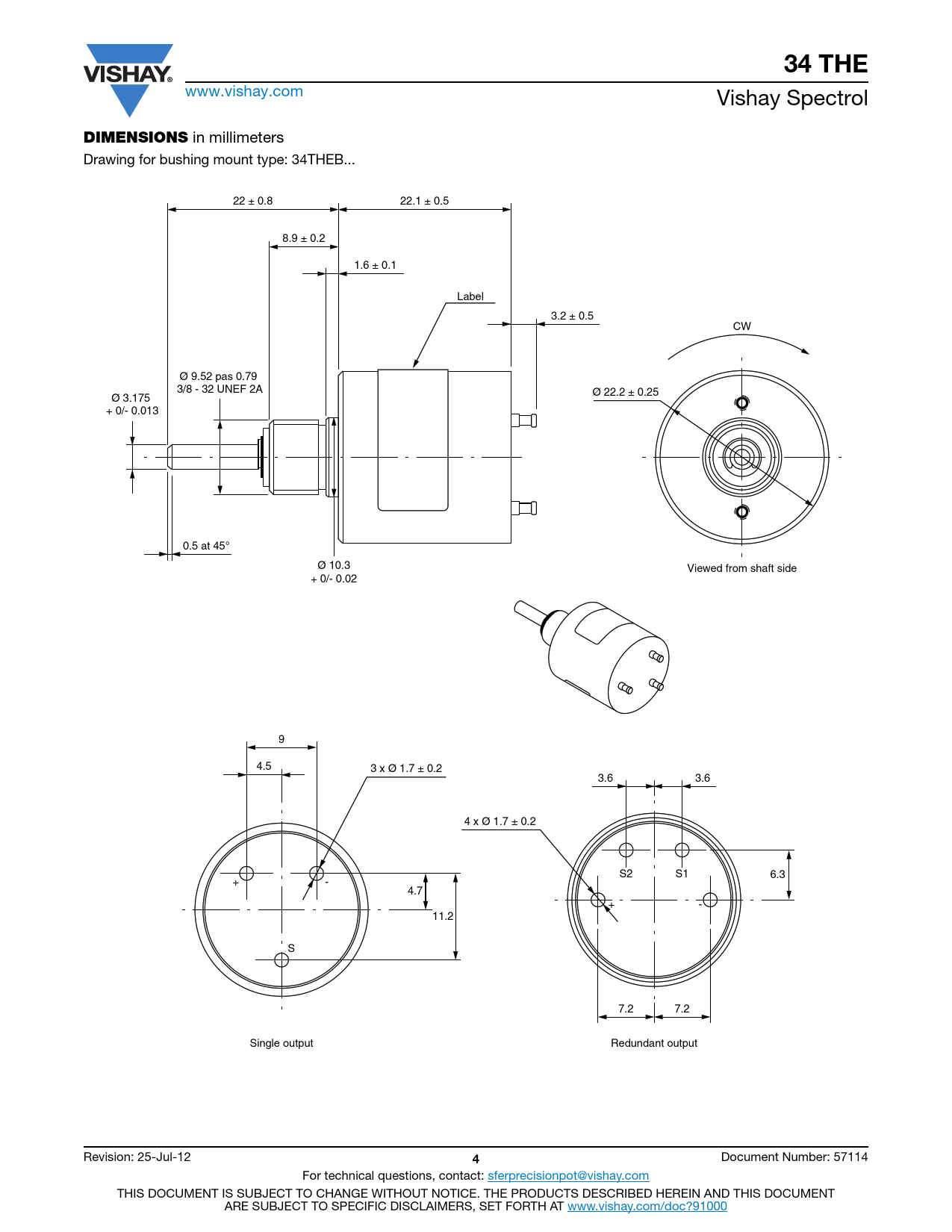 in millimeters Drawing for bushing mount type: 34THEB... 22 ± 0.8 22.1 ± 0.5 8.9 ± 0.2 1.6 ± 0.1 Label 3.2 ± 0.5 CW Ø 9.52 pas 0.79 3/8 - 32 UNEF 2A Ø 22.2 ± 0.25 Ø 3.175 + 0/- 0.013 0.5 at 45° Ø 10.3 Viewed from shaft side + 0/- 0.02 9 4.5 3 x Ø 1.7 ± 0.2 3.6 3.6 4 x Ø 1.7 ± 0.2 S2 S1 6.3 + - 4.7 + - 11.2 S 7.2 7.2 Single output Redundant output Revision: 25-Jul-12