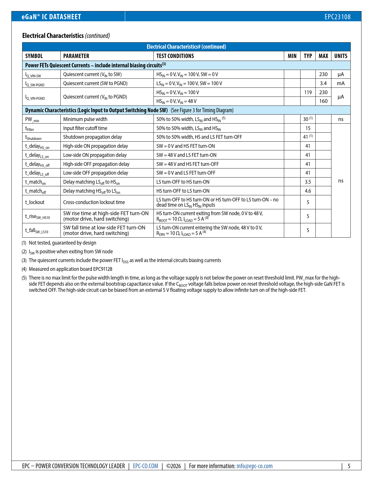 (See Figure 3 for Timing Diagram) PW_min Minimum pulse width 50% to 50% width, LSIN and HSIN (5) 30 (1) ns tFilter Input filter cutoff time 50% to 50% width, LSIN and HSIN 15 tShutdown Shutdown propagation delay 50% to 50% width, HS and LS FET turn-OFF 41 (1) t_delayHS_on High-side ON propagation delay SW = 0 V and HS FET turn-ON 41 t_delayLS_on Low-side ON propagation delay SW = 48 V and LS FET turn-ON 41 t_delayHS_off High-side OFF propagation delay SW = 48 V and HS FET turn-OFF 41 t_delayLS_off Low-side OFF propagation delay SW = 0 V and LS FET turn-OFF 41 t_match ns on Delay matching LSoff to HSon LS turn-OFF to HS turn-ON 3.5 t_matchoff Delay matching HSoff to LSon HS turn-OFF to LS turn-ON 4.6 t_lockout Cross-conduction lockout time LS turn-OFF to HS turn-ON or HS turn-OFF to LS turn-ON – no dead time on LSIN HSIN inputs 5 t_rise SW rise time at high-side FET turn-ON HS turn-ON current exiting from SW node, 0 V to 48 V, SW_HS10 (motor drive, hard switching) RBOOT = 10 Ω, ILOAD = 5 A (4) 5 t_fall SW fall time at low-side FET turn-ON LS turn-ON current entering the SW node, 48 V to 0 V, SW_LS10 (motor drive, hard switching) RDRV = 10 Ω, ILOAD = 5 A (4) 5 (1) Not tested, guaranteed by design (2) ISW is positive when exiting from SW node (3) The quiescent currents include the power FET IDSS as well as the internal circuits biasing currents (4) Measured on application board EPC91128 (5) There is no max limit for the pulse width length in time, as long as the voltage supply is not below the power on reset threshold limit. PW_max for the high- side FET depends also on the external bootstrap capacitance value. If the CBOOT voltage fal s below power on reset threshold voltage, the high-side GaN FET is switched OFF. The high-side circuit can be biased from an external 5 V floating voltage supply to al ow infinite turn on of the high-side FET. EPC – POWER CONVERSION TECHNOLOGY LEADER | EPC-CO.COM | ©2026 | For more information: info@epc-co.com | 5