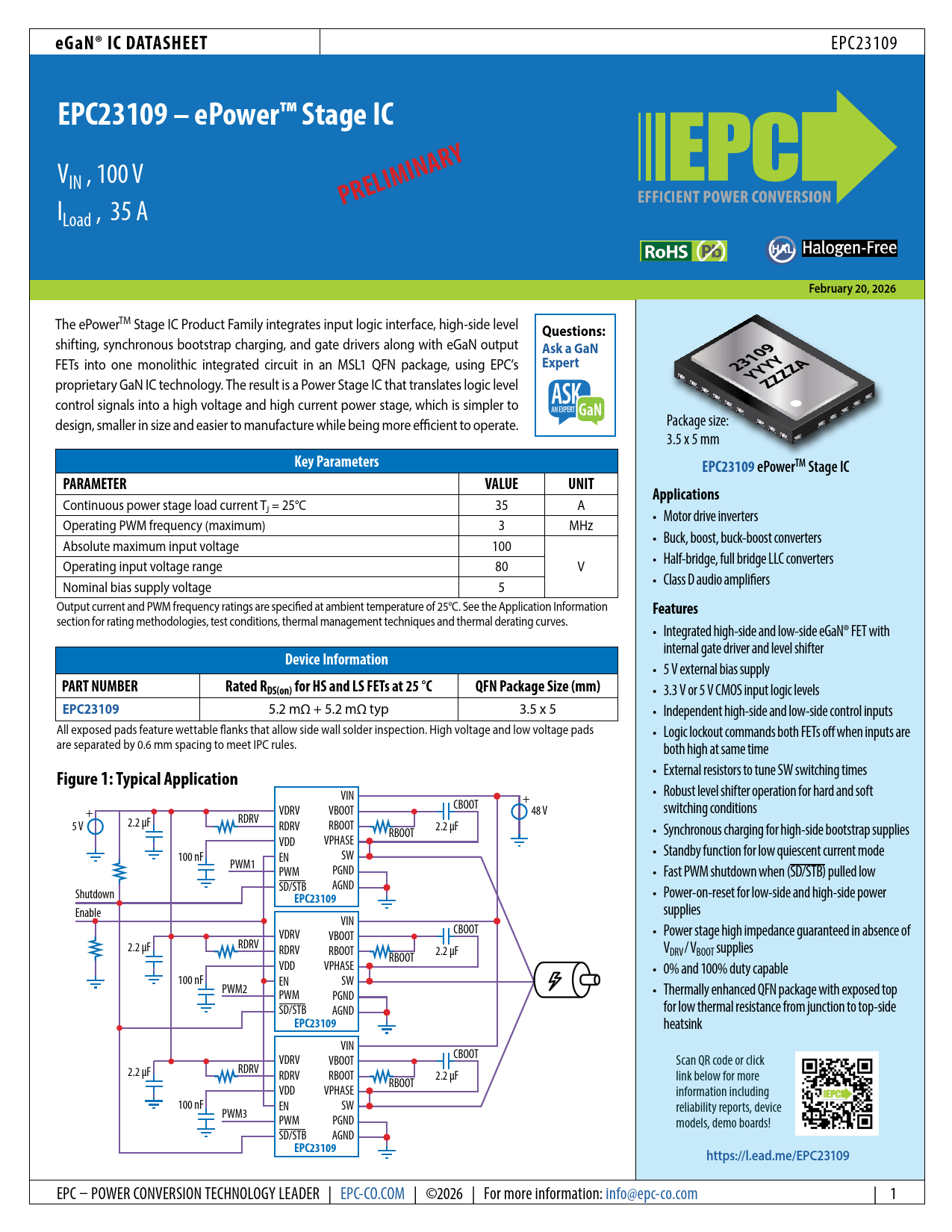 eGaN® IC DATASHEET. EPC23109 – ePower™ Stage IC. PRELIMINARY. HAL. February 20, 2026. Questions:. Ask a GaN. Expert. 23109. YYYY. ZZZZ