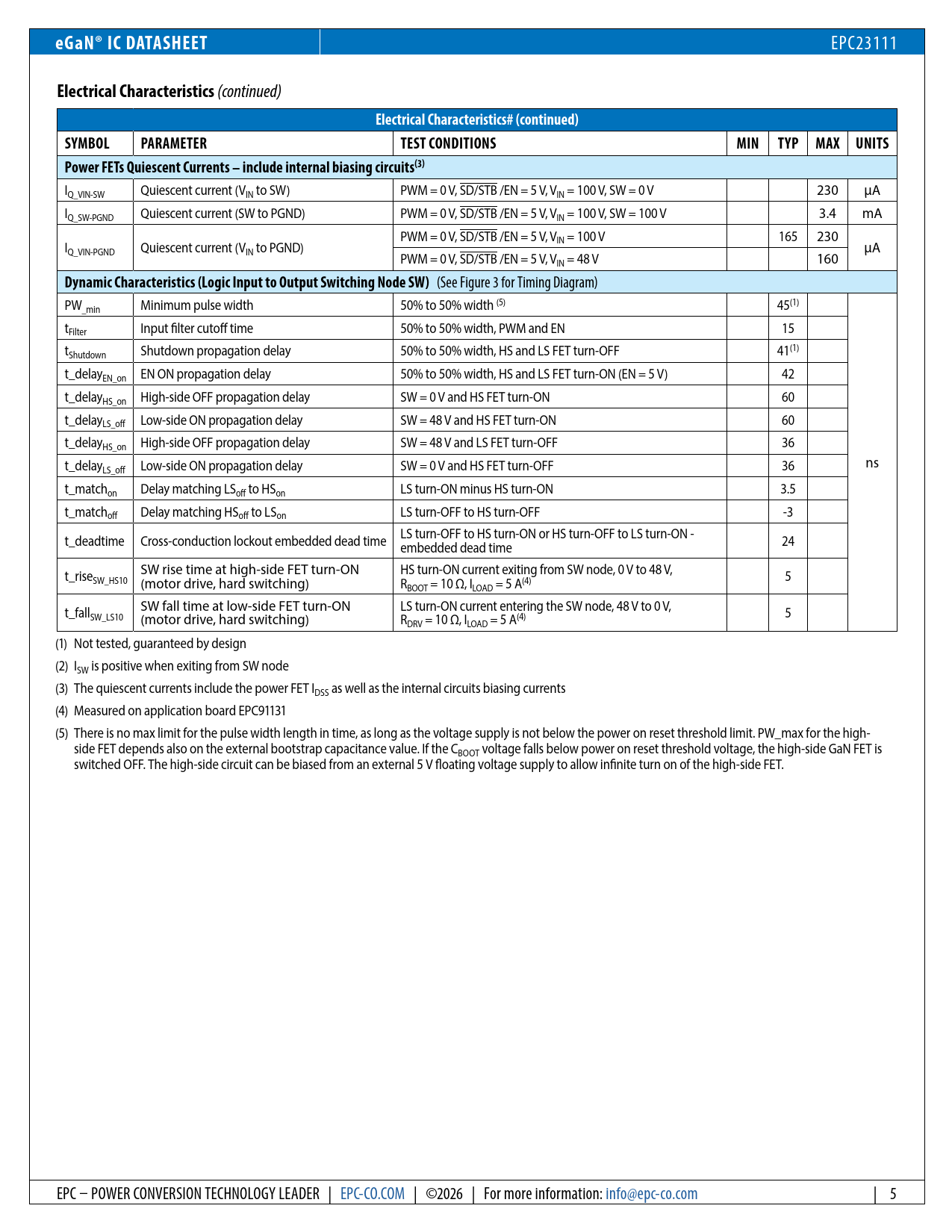 (See Figure 3 for Timing Diagram) PW_min Minimum pulse width 50% to 50% width (5) 45(1) tFilter Input filter cutoff time 50% to 50% width, PWM and EN 15 tShutdown Shutdown propagation delay 50% to 50% width, HS and LS FET turn-OFF 41(1) t_delayEN_on EN ON propagation delay 50% to 50% width, HS and LS FET turn-ON (EN = 5 V) 42 t_delayHS_on High-side OFF propagation delay SW = 0 V and HS FET turn-ON 60 t_delayLS_off Low-side ON propagation delay SW = 48 V and HS FET turn-ON 60 t_delayHS_on High-side OFF propagation delay SW = 48 V and LS FET turn-OFF 36 t_delay ns LS_off Low-side ON propagation delay SW = 0 V and HS FET turn-OFF 36 t_matchon Delay matching LSoff to HSon LS turn-ON minus HS turn-ON 3.5 t_matchoff Delay matching HSoff to LSon LS turn-OFF to HS turn-OFF -3 t_deadtime Cross-conduction lockout embedded dead time LS turn-OFF to HS turn-ON or HS turn-OFF to LS turn-ON - embedded dead time 24 t_rise SW rise time at high-side FET turn-ON HS turn-ON current exiting from SW node, 0 V to 48 V, SW_HS10 (motor drive, hard switching) RBOOT = 10 Ω, ILOAD = 5 A(4) 5 t_fall SW fall time at low-side FET turn-ON LS turn-ON current entering the SW node, 48 V to 0 V, SW_LS10 (motor drive, hard switching) RDRV = 10 Ω, ILOAD = 5 A(4) 5 (1) Not tested, guaranteed by design (2) ISW is positive when exiting from SW node (3) The quiescent currents include the power FET IDSS as well as the internal circuits biasing currents (4) Measured on application board EPC91131 (5) There is no max limit for the pulse width length in time, as long as the voltage supply is not below the power on reset threshold limit. PW_max for the high- side FET depends also on the external bootstrap capacitance value. If the CBOOT voltage fal s below power on reset threshold voltage, the high-side GaN FET is switched OFF. The high-side circuit can be biased from an external 5 V floating voltage supply to al ow infinite turn on of the high-side FET. EPC – POWER CONVERSION TECHNOLOGY LEADER | EPC-CO.COM | ©2026 | For more information: info@epc-co.com | 5