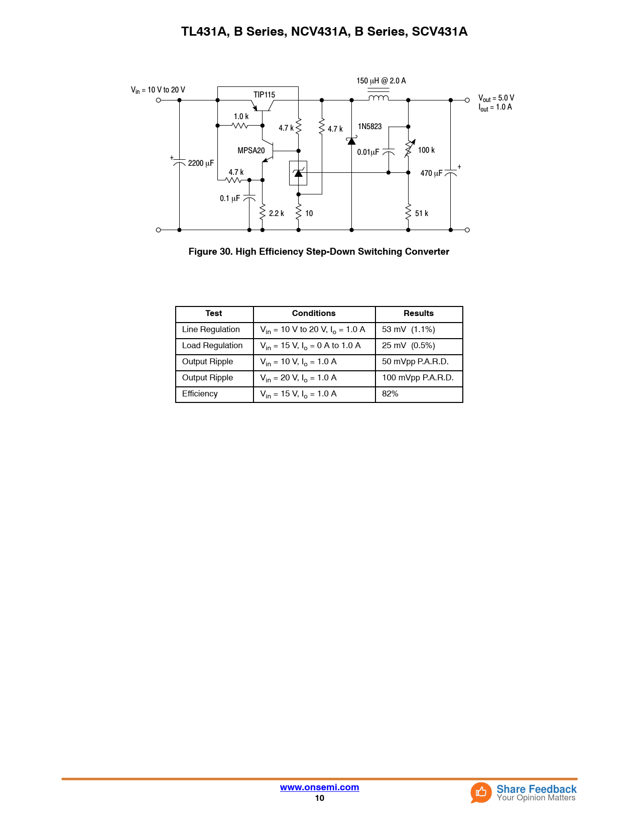 TL431A, B Series, NCV431A, B Series, SCV431A 150 mH @ 2.0 A Vin = 10 V to 20 V TIP115 Vout = 5.0 V Iout = 1.0 A 1.0 k 4.7 k 1N5823 4.7 k MPSA20 0.01mF 100 k + 2200 mF + 4.7 k 470 mF 0.1 mF 2.2 k 10 51 k Figure 30. High Efficiency Step-Down Switching ConverterTestConditionsResults Line Regulation Vin = 10 V to 20 V, Io = 1.0 A 53 mV (1.1%) Load Regulation Vin = 15 V, Io = 0 A to 1.0 A 25 mV (0.5%) Output Ripple Vin = 10 V, Io = 1.0 A 50 mVpp P.A.R.D. Output Ripple Vin = 20 V, Io = 1.0 A 100 mVpp P.A.R.D. Efficiency Vin = 15 V, Io = 1.0 A 82% www.onsemi.comShare Feedback10 Your Opinion Matters