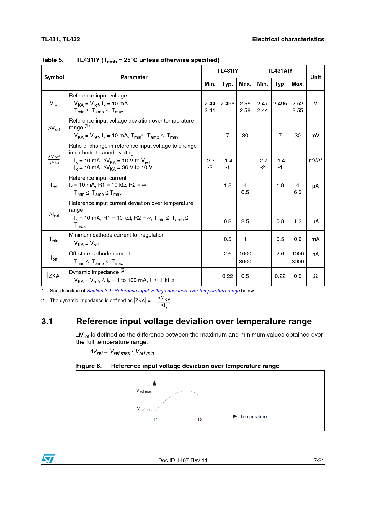 TL431, TL432. Electrical characteristics. Table 5. TL431IY (Tamb = 25°C unless otherwise specified). TL431IY. TL431AIY. Symbol