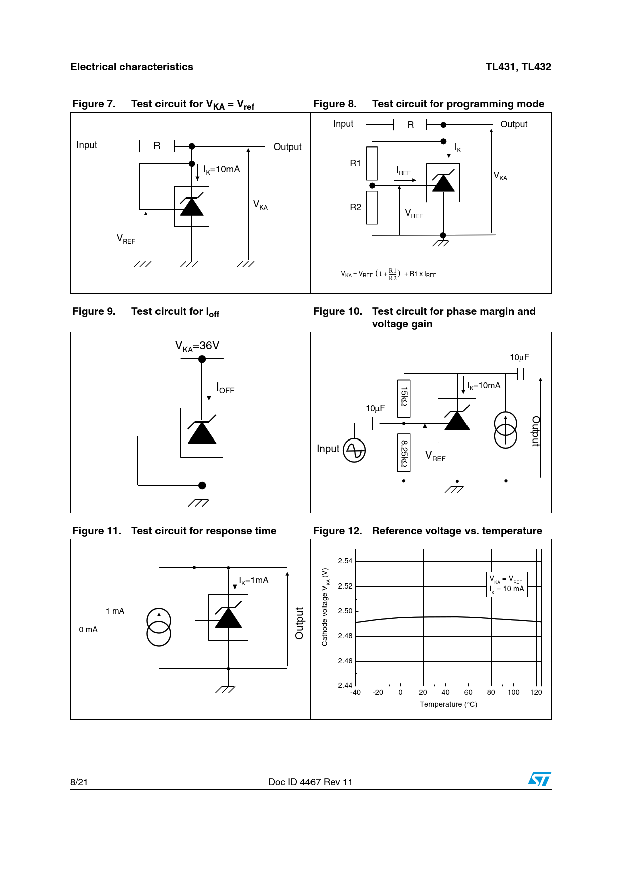 Electrical characteristicsTL431, TL432Figure 7.Test circuit for VKA = VrefFigure 8.Test circuit for programming mode Input R Output Input R Output IK R1 I =10mA K IREF VKA VKA R2 VREF VREF R1 V ( ) KA = VREF 1 + ---- + R1 x IREF R2 Figure 9.Test circuit for IoffFigure 10.Test circuit for phase margin and voltage gain V =36V KA 10μF I 15 I =10mA OFF K k Ω 10μF Out p u 8.2 t Input 5 k V Ω REF Figure 11.Test circuit for response timeFigure 12.Reference voltage vs. temperature 2.54 I =1mA (V) V = V K KA REF KA 2.52 V I = 10 mA K t ltage 1 mA u o 2.50 tp de v 0 mA Ou tho 2.48 a C 2.46 2.44 -40 -20 0 20 40 60 80 100 120 Temperature (°C) 8/21 Doc ID 4467 Rev 11 Document Outline 1 Schematic diagrams Figure 1. TO-92 pin connections (top view) Figure 2. SO-8 batwing pin connections (top view) Figure 3. SOT23-5 and SOT23-3 pin connections (top view) Figure 4. SOT323-6 pin connections (top view) Figure 5. TL431 and TL432 block diagram 2 Absolute maximum ratings and operating conditions Table 1. Absolute maximum ratings Table 2. Operating conditions 3 Electrical characteristics Table 3. TL431C (Tamb = 25˚ C unless otherwise specified) Table 4. TL431I/TL432I (Tamb = 25˚C unless otherwise specified) Table 5. TL431IY (Tamb = 25˚C unless otherwise specified) 3.1 Reference input voltage deviation over temperature range Figure 6. Reference input voltage deviation over temperature range Figure 7. Test circuit for VKA = Vref Figure 8. Test circuit for programming mode Figure 9. Test circuit for Ioff Figure 10. Test circuit for phase margin and voltage gain Figure 11. Test circuit for response time Figure 12. Reference voltage vs. temperature Figure 13. Reference voltage vs. cathode current Figure 14. Zoom on reference voltage vs. cathode current Figure 15. Reference current vs. temperature Figure 16. Off-state cathode current vs. temperature Figure 17. Ratio of change in Vref to change in VKA vs. temperature Figure 18. Static impedance RKA vs. temperature Figure 19. Minimum operating current vs. temperature Figure 20. Gain and phase vs. frequency Figure 21. Stability behavior with capacitive loads Figure 22. Maximum power dissipation Figure 23. Pulse response for Ik = 1 mA 4 Package mechanical data 4.1 SO-8 package information Figure 24. SO-8 package mechanical drawing Table 6. SO-8 package mechanical data 4.2 TO-92 ammopack and tape and reel package information Figure 25. TO-92 ammopack and tape and reel package mechanical drawing Table 7. TO-92 ammopack and tape and reel package mechanical data 4.3 TO-92 (bulk) package information Figure 26. TO-92 bulk package mechanical drawing Table 8. TO-92 bulk package mechanical data 4.4 SOT23-3 package information Figure 27. SOT23-3 package mechanical drawing Table 9. SOT23-3 package mechanical data 4.5 SOT23-5 package information Figure 28. SOT23-5 package mechanical drawing Table 10. SOT23-5 package mechanical data 4.6 SOT323-6 package information Figure 29. SOT323-6 package mechanical drawing Table 11. SOT323-6 package mechanical data 5 Ordering information Table 12. Order codes 6 Revision history Table 13. Document revision history