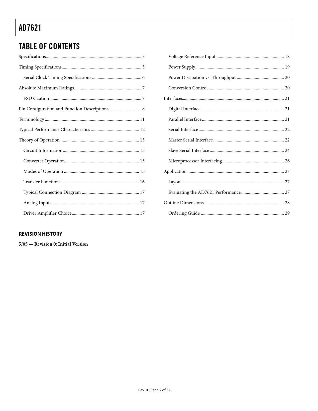 AD7621 TABLE OF CONTENTS REVISION HISTORY 5/05 — Revision 0: Initial Version