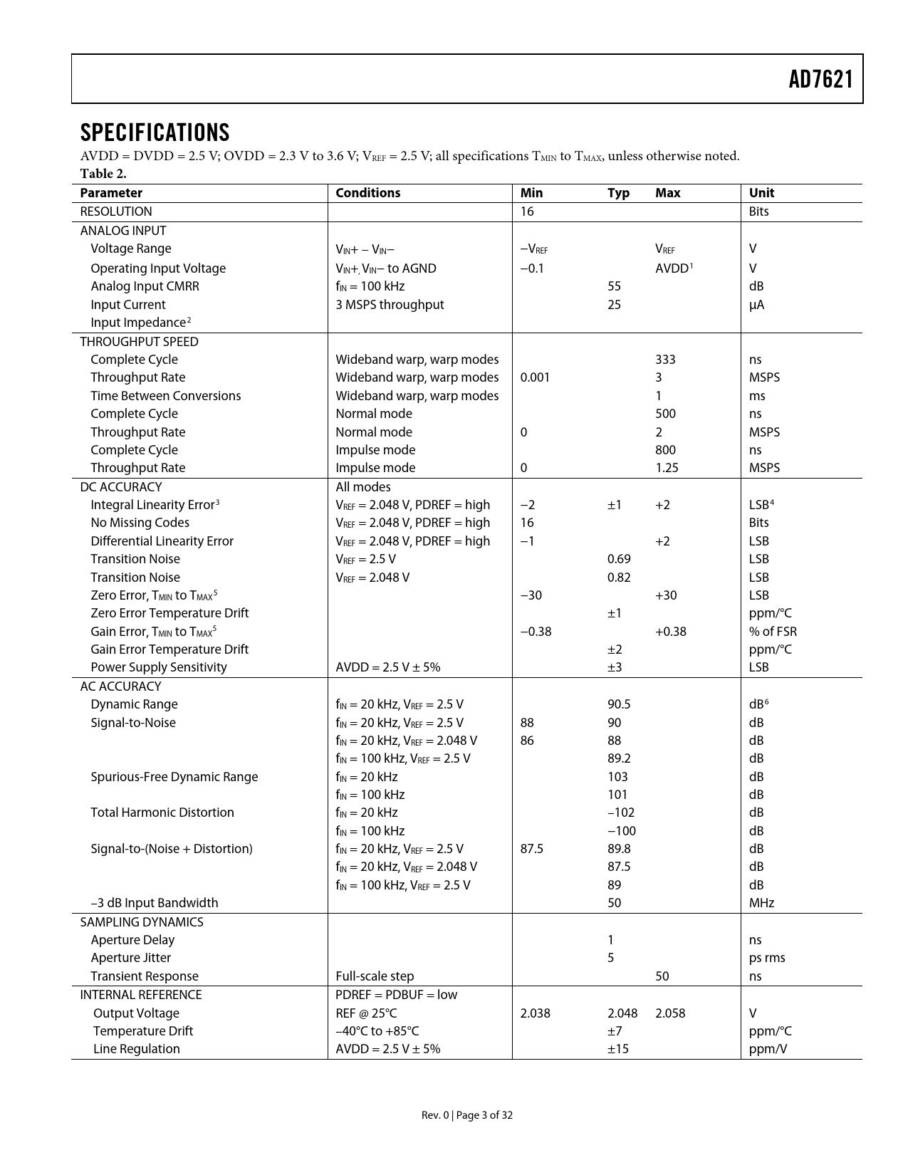 link to page 4 link to page 4 link to page 4 link to page 4 link to page 4 link to page 4 link to page 4 AD7621SPECIFICATIONS AVDD = DVDD = 2.5 V; OVDD = 2.3 V to 3.6 V; VREF = 2.5 V; all specifications TMIN to TMAX, unless otherwise noted. Table 2. Parameter ConditionsMinTypMaxUnit RESOLUTION 16 Bits ANALOG INPUT Voltage Range VIN+ − VIN− −VREF VREF V Operating Input Voltage VIN+, VIN− to AGND −0.1 AVDD1 V Analog Input CMRR fIN = 100 kHz 55 dB Input Current 3 MSPS throughput 25 μA Input Impedance2 THROUGHPUT SPEED Complete Cycle Wideband warp, warp modes 333 ns Throughput Rate Wideband warp, warp modes 0.001 3 MSPS Time Between Conversions Wideband warp, warp modes 1 ms Complete Cycle Normal mode 500 ns Throughput Rate Normal mode 0 2 MSPS Complete Cycle Impulse mode 800 ns Throughput Rate Impulse mode 0 1.25 MSPS DC ACCURACY All modes Integral Linearity Error3 VREF = 2.048 V, PDREF = high −2 ±1 +2 LSB4 No Missing Codes VREF = 2.048 V, PDREF = high 16 Bits Differential Linearity Error VREF = 2.048 V, PDREF = high −1 +2 LSB Transition Noise VREF = 2.5 V 0.69 LSB Transition Noise VREF = 2.048 V 0.82 LSB Zero Error, T 5 MIN to TMAX −30 +30 LSB Zero Error Temperature Drift ±1 ppm/°C Gain Error, T 5 MIN to TMAX −0.38 +0.38 % of FSR Gain Error Temperature Drift ±2 ppm/°C Power Supply Sensitivity AVDD = 2.5 V ± 5% ±3 LSB AC ACCURACY Dynamic Range fIN = 20 kHz, VREF = 2.5 V 90.5 dB6 Signal-to-Noise fIN = 20 kHz, VREF = 2.5 V 88 90 dB fIN = 20 kHz, VREF = 2.048 V 86 88 dB fIN = 100 kHz, VREF = 2.5 V 89.2 dB Spurious-Free Dynamic Range fIN = 20 kHz 103 dB fIN = 100 kHz 101 dB Total Harmonic Distortion fIN = 20 kHz –102 dB fIN = 100 kHz −100 dB Signal-to-(Noise + Distortion) fIN = 20 kHz, VREF = 2.5 V 87.5 89.8 dB fIN = 20 kHz, VREF = 2.048 V 87.5 dB fIN = 100 kHz, VREF = 2.5 V 89 dB –3 dB Input Bandwidth 50 MHz SAMPLING DYNAMICS Aperture Delay 1 ns Aperture Jitter 5 ps rms Transient Response Full-scale step 50 ns INTERNAL REFERENCE PDREF = PDBUF = low Output Voltage REF @ 25°C 2.038 2.048 2.058 V Temperature Drift –40°C to +85°C ±7 ppm/°C Line Regulation AVDD = 2.5 V ± 5% ±15 ppm/V Rev. 0 | Page 3 of 32 Document Outline FEATURES APPLICATIONS GENERAL DESCRIPTION FUNCTIONAL BLOCK DIAGRAM PRODUCT HIGHLIGHTS SPECIFICATIONS TIMING SPECIFICATIONS SERIAL CLOCK TIMING SPECIFICATIONS ABSOLUTE MAXIMUM RATINGS ESD CAUTION PIN CONFIGURATION AND FUNCTION DESCRIPTIONS TERMINOLOGY TYPICAL PERFORMANCE CHARACTERISTICS THEORY OF OPERATION CIRCUIT INFORMATION CONVERTER OPERATION MODES OF OPERATION TRANSFER FUNCTIONS TYPICAL CONNECTION DIAGRAM ANALOG INPUTS DRIVER AMPLIFIER CHOICE Single-to-Differential Driver VOLTAGE REFERENCE INPUT Internal Reference External 1.2 V Reference and Internal Buffer External Reference Reference Decoupling Temperature Sensor POWER SUPPLY Power Sequencing Power-Up POWER DISSIPATION VS. THROUGHPUT CONVERSION CONTROL INTERFACES DIGITAL INTERFACE RESET PARALLEL INTERFACE Master Parallel Interface Slave Parallel Interface 8-Bit Interface (Master or Slave) SERIAL INTERFACE MASTER SERIAL INTERFACE Internal Clock SLAVE SERIAL INTERFACE External Clock External Discontinuous Clock Data Read After Conversion External Clock Data Read During Previous Conversion MICROPROCESSOR INTERFACING SPI Interface (ADSP-219x) APPLICATION LAYOUT EVALUATING THE AD7621 PERFORMANCE OUTLINE DIMENSIONS ORDERING GUIDE