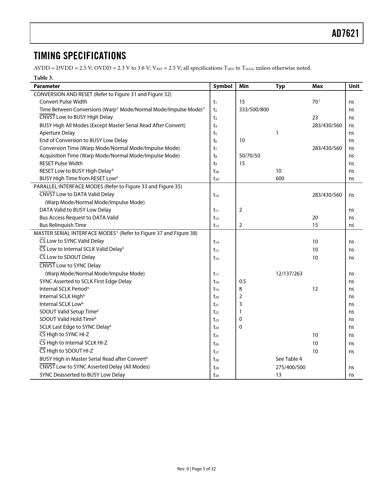 Seiten / Seite32 / 5 — AD7621. TIMING SPECIFICATIONS. Table 3. Parameter Symbol. Min. Typ. Max. …