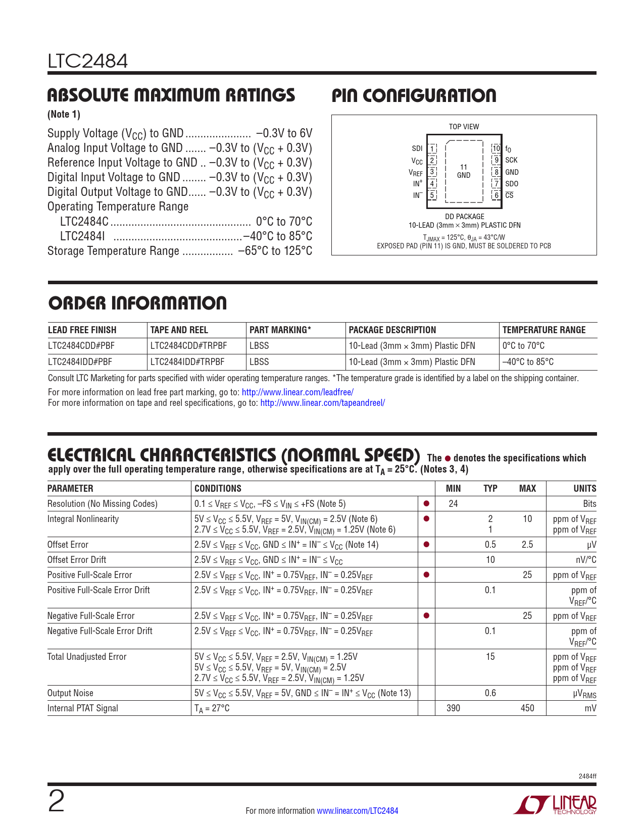 LTC2484 absoluTe MaxiMuM raTingspin conFiguraTion(Note 1) Supply Voltage (V TOP VIEW CC) to GND .. –0.3V to 6V Analog Input Voltage to GND ... –0.3V to (VCC + 0.3V) SDI 1 10 fO Reference Input Voltage to GND .. –0.3V to (VCC + 0.3V) VCC 2 9 SCK 11 Digital Input Voltage to GND .. –0.3V to (V VREF 3 8 GND CC + 0.3V) GND IN+ 4 7 SDO Digital Output Voltage to GND .. –0.3V to (VCC + 0.3V) IN– 5 6 CS Operating Temperature Range LTC2484C ... 0°C to 70°C DD PACKAGE 10-LEAD (3mm × 3mm) PLASTIC DFN LTC2484I ...–40°C to 85°C TJMAX = 125°C, θJA = 43°C/W Storage Temperature Range ... –65°C to 125°C EXPOSED PAD (PIN 11) IS GND, MUST BE SOLDERED TO PCB orDer inForMaTion LEAD FREE FINISHTAPE AND REELPART MARKING*PACKAGE DESCRIPTIONTEMPERATURE RANGE LTC2484CDD#PBF LTC2484CDD#TRPBF LBSS 10-Lead (3mm × 3mm) Plastic DFN 0°C to 70°C LTC2484IDD#PBF LTC2484IDD#TRPBF LBSS 10-Lead (3mm × 3mm) Plastic DFN –40°C to 85°C Consult LTC Marketing for parts specified with wider operating temperature ranges. *The temperature grade is identified by a label on the shipping container. For more information on lead free part marking, go to: http://www.linear.com/leadfree/ For more information on tape and reel specifications, go to: http://www.linear.com/tapeandreel/ e lecTrical characTerisTics (norMal speeD) The l denotes the specifications whichapply over the full operating temperature range, otherwise specifications are at TA = 25°C. (Notes 3, 4)PARAMETERCONDITIONSMINTYPMAXUNITS Resolution (No Missing Codes) 0.1 ≤ VREF ≤ VCC, –FS ≤ VIN ≤ +FS (Note 5) l 24 Bits Integral Nonlinearity 5V ≤ VCC ≤ 5.5V, VREF = 5V, VIN(CM) = 2.5V (Note 6) l 2 10 ppm of VREF 2.7V ≤ VCC ≤ 5.5V, VREF = 2.5V, VIN(CM) = 1.25V (Note 6) 1 ppm of VREF Offset Error 2.5V ≤ VREF ≤ VCC, GND ≤ IN+ = IN– ≤ VCC (Note 14) l 0.5 2.5 µV Offset Error Drift 2.5V ≤ VREF ≤ VCC, GND ≤ IN+ = IN– ≤ VCC 10 nV/°C Positive Full-Scale Error 2.5V ≤ VREF ≤ VCC, IN+ = 0.75VREF , IN– = 0.25VREF l 25 ppm of VREF Positive Full-Scale Error Drift 2.5V ≤ VREF ≤ VCC, IN+ = 0.75VREF , IN– = 0.25VREF 0.1 ppm of VREF/°C Negative Full-Scale Error 2.5V ≤ VREF ≤ VCC, IN+ = 0.75VREF , IN– = 0.25VREF l 25 ppm of VREF Negative Full-Scale Error Drift 2.5V ≤ VREF ≤ VCC, IN+ = 0.75VREF , IN– = 0.25VREF 0.1 ppm of VREF/°C Total Unadjusted Error 5V ≤ VCC ≤ 5.5V, VREF = 2.5V, VIN(CM) = 1.25V 15 ppm of VREF 5V ≤ VCC ≤ 5.5V, VREF = 5V, VIN(CM) = 2.5V ppm of VREF 2.7V ≤ VCC ≤ 5.5V, VREF = 2.5V, VIN(CM) = 1.25V ppm of VREF Output Noise 5V ≤ VCC ≤ 5.5V, VREF = 5V, GND ≤ IN– = IN+ ≤ VCC (Note 13) 0.6 µVRMS Internal PTAT Signal TA = 27°C 390 450 mV 2484ff 2 For more information www.linear.com/LTC2484 Document Outline Features Applications Typical Application Description Absolute Maximum Ratings Order Information Electrical Characteristics (Normal Speed) Pin Configuration Electrical Characteristics (2x Speed) Converter Characteristics Analog Input and Reference Digital Inputs and Digital Outputs Power Requirements Timing Characteristics Typical Performance Characteristics Pin Functions Functional Block Diagram Test Circuits Timing Diagrams Applications Information Package Description Revision History Typical Application Related Parts