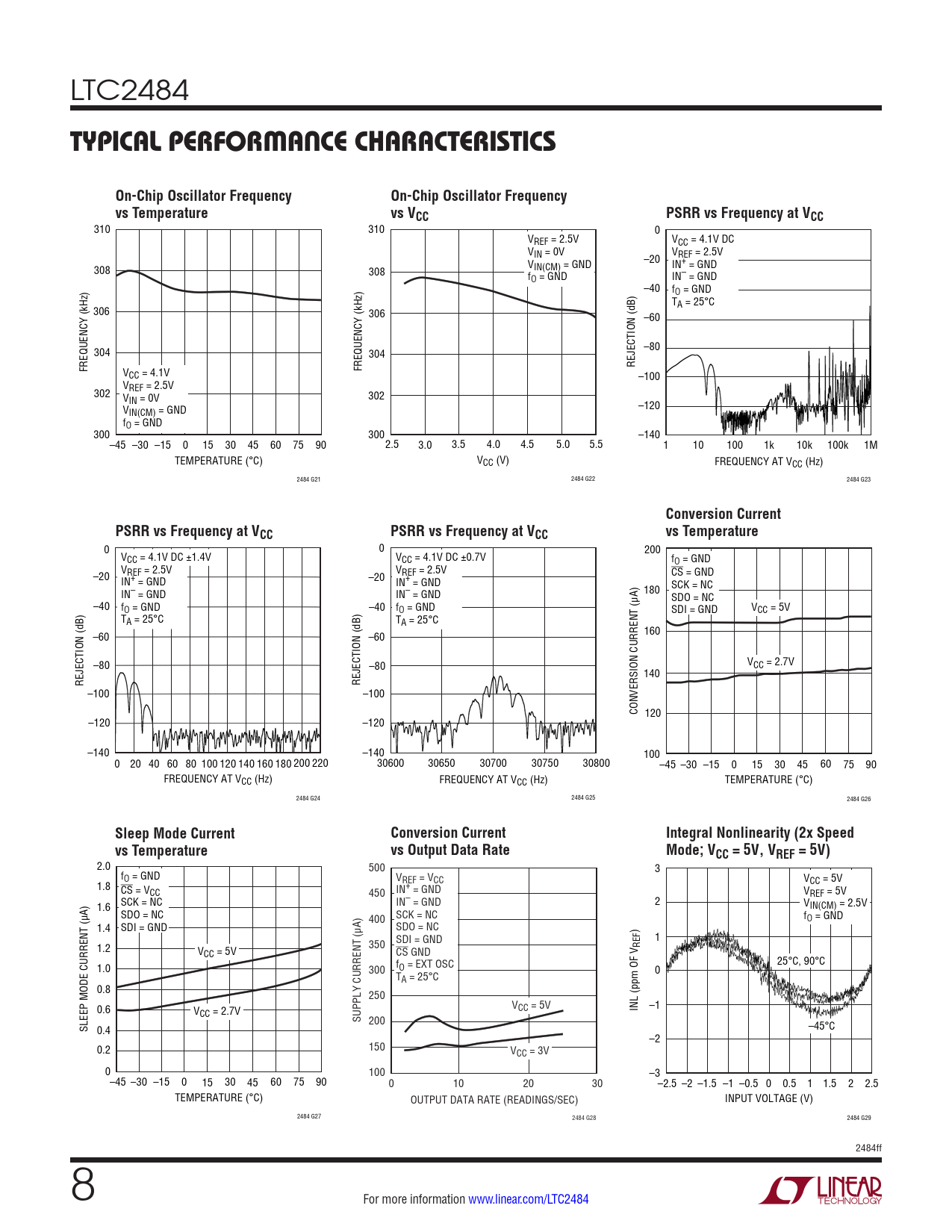0 0 200 VCC = 4.1V DC ±1.4V VCC = 4.1V DC ±0.7V fO = GND V –20 REF = 2.5V VREF = 2.5V CS = GND IN+ = GND –20 IN+ = GND SCK = NC IN– = GND IN– = GND 180 SDO = NC –40 fO = GND –40 fO = GND SDI = GND VCC = 5V TA = 25°C TA = 25°C –60 –60 160 –80 –80 VCC = 2.7V 140 REJECTION (dB) REJECTION (dB) –100 –100 CONVERSION CURRENT (µA) 120 –120 –120 –140 –140 100 0 20 40 60 80 100 120 140 160 180 200 220 30600 30650 30700 30750 30800 –45 –30 –15 0 15 30 45 60 75 90 FREQUENCY AT VCC (Hz) FREQUENCY AT VCC (Hz) TEMPERATURE (°C) 2484 G24 2484 G25 2484 G26