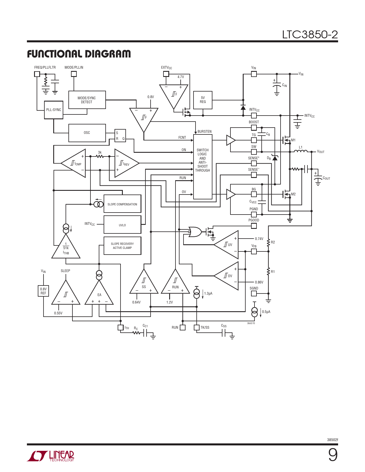 FREQ/PLLFLTR MODE/PLLIN EXTV V CC IN VIN 4.7V + CIN – + F 0.8V MODE/SYNC 5V DETECT REG PLL-SYNC INTV – + CC INTVCC F BOOST OSC S BURSTEN TG CB R Q FCNT M1 SW L1 ON SWITCH 3k VOUT + – LOGIC AND SENSE+ DB ANTI- ICMP IREV SHOOT – + THROUGH SENSE– + RUN COUT BG OV M2 CVCC SLOPE COMPENSATION PGND PGOOD INTVCC UVLO + 0.74V 1 SLOPE RECOVERY R2 UV V 51k ACTIVE CLAMP FB I – THB + VIN SLEEP R1 OV – 0.86V – SS + RUN – + SGND 0.8V REF 1.3μA EA – + + + – 0.64V 1.2V 0.5μA 0.55V 38502 FD C C I C1 SS TH R RUN TK/SS C 38502f 9