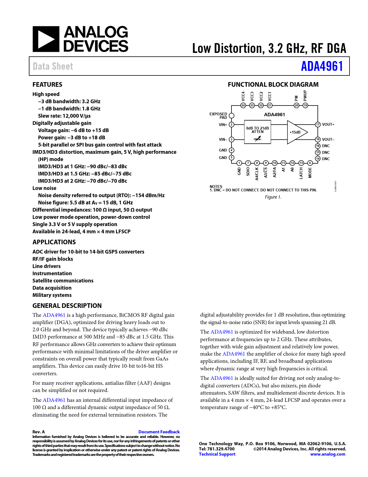 | Seiten / Seite | 24 / 1 — Low Distortion, 3.2 GHz, RF DGA. Data Sheet. ADA4961. FEATURES. … |