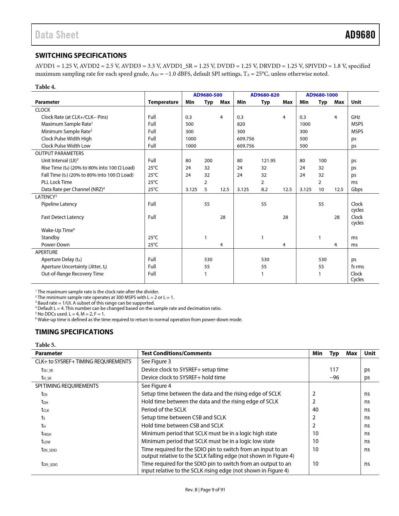 Data Sheet AD9680 SWITCHING SPECIFICATIONS Table 4 AD9680-500 AD9680-820 AD9680-1000 Parameter Temperature Min Typ Max Min Typ
