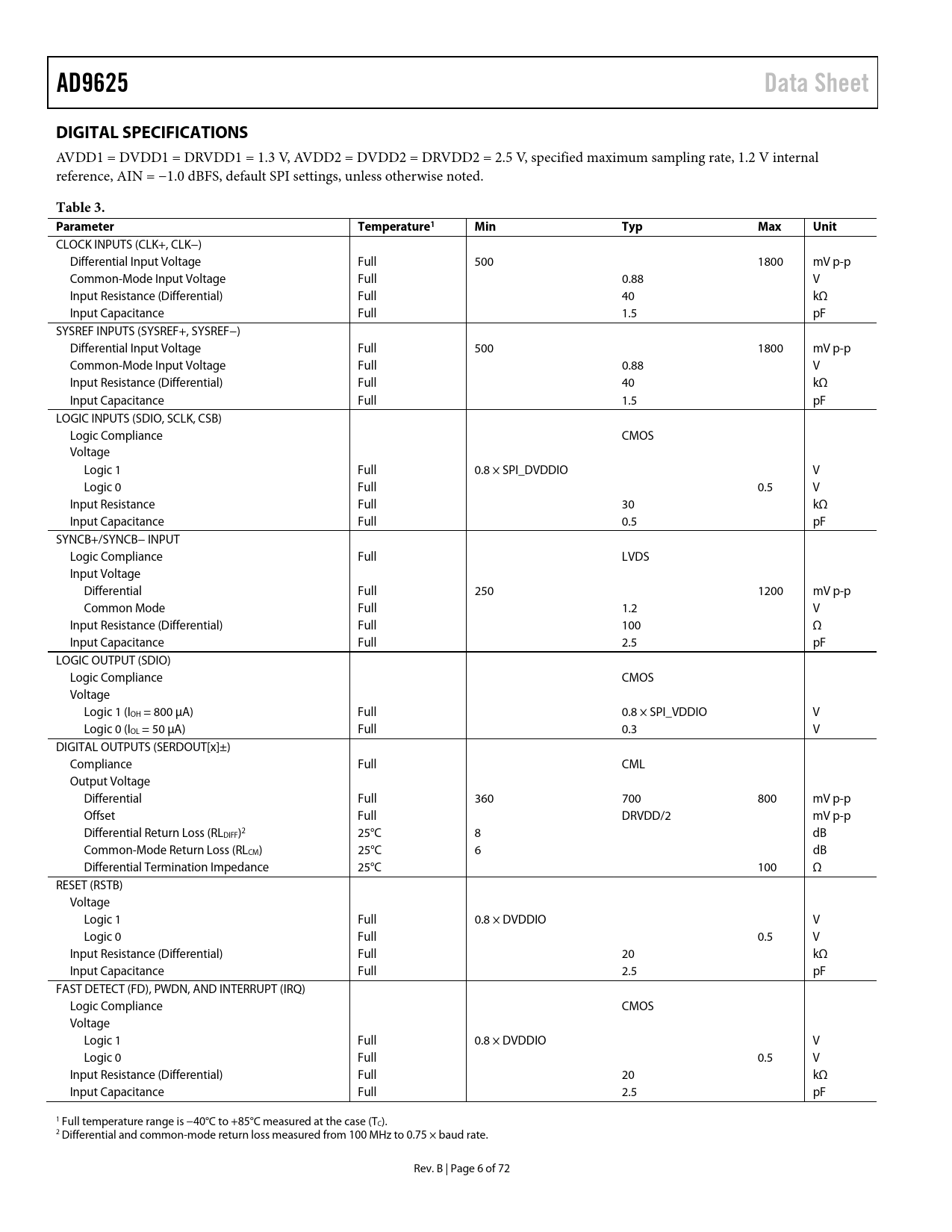 Seiten / Seite72 / 6 — AD9625. Data Sheet. DIGITAL SPECIFICATIONS. Table 3. Parameter. …