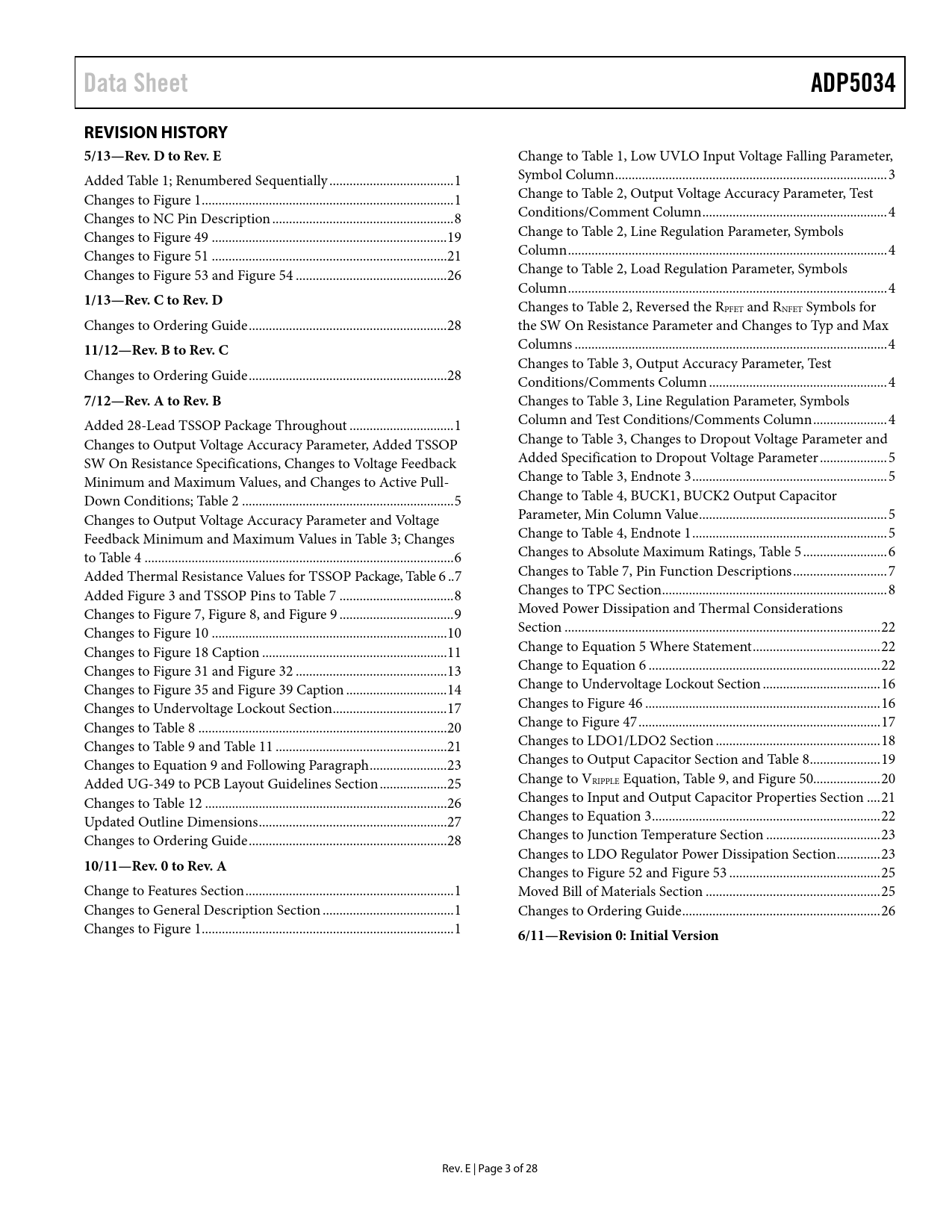 Data SheetADP5034REVISION HISTORY 5/13—Rev. D to Rev. E Change to Table 1, Low UVLO Input Voltage Falling Parameter, Added Table 1; Renumbered Sequential y ... 1 Symbol Column ... 3 Changes to Figure 1... 1 Change to Table 2, Output Voltage Accuracy Parameter, Test Changes to NC Pin Description .. 8 Conditions/Comment Column ... 4 Changes to Figure 49 .. 19 Change to Table 2, Line Regulation Parameter, Symbols Changes to Figure 51 .. 21 Column ... 4 Changes to Figure 53 and Figure 54 ... 26 Change to Table 2, Load Regulation Parameter, Symbols Column ... 4 1/13—Rev. C to Rev. D Changes to Table 2, Reversed the RPFET and RNFET Symbols for Changes to Ordering Guide ... 28 the SW On Resistance Parameter and Changes to Typ and Max 11/12—Rev. B to Rev. C Columns ... 4 Changes to Table 3, Output Accuracy Parameter, Test Changes to Ordering Guide ... 28 Conditions/Comments Column ... 4 7/12—Rev. A to Rev. B Changes to Table 3, Line Regulation Parameter, Symbols Added 28-Lead TSSOP Package Throughout ... 1 Column and Test Conditions/Comments Column .. 4 Changes to Output Voltage Accuracy Parameter, Added TSSOP Change to Table 3, Changes to Dropout Voltage Parameter and SW On Resistance Specifications, Changes to Voltage Feedback Added Specification to Dropout Voltage Parameter .. 5 Minimum and Maximum Values, and Changes to Active Pul - Change to Table 3, Endnote 3 .. 5 Down Conditions; Table 2 ... 5 Change to Table 4, BUCK1, BUCK2 Output Capacitor Changes to Output Voltage Accuracy Parameter and Voltage Parameter, Min Column Value .. 5 Feedback Minimum and Maximum Values in Table 3; Changes Change to Table 4, Endnote 1 .. 5 to Table 4 .. 6 Changes to Absolute Maximum Ratings, Table 5 ... 6 Added Thermal Resistance Values for TSSOP Package, Table 6 . 7 Changes to Table 7, Pin Function Descriptions .. 7 Added Figure 3 and TSSOP Pins to Table 7 .. 8 Changes to TPC Section ... 8 Changes to Figure 7, Figure 8, and Figure 9 .. 9 Moved Power Dissipation and Thermal Considerations Changes to Figure 10 .. 10 Section .. 22 Changes to Figure 18 Caption ... 11 Change to Equation 5 Where Statement .. 22 Changes to Figure 31 and Figure 32 ... 13 Change to Equation 6 ... 22 Changes to Figure 35 and Figure 39 Caption .. 14 Change to Undervoltage Lockout Section ... 16 Changes to Undervoltage Lockout Section .. 17 Changes to Figure 46 .. 16 Changes to Table 8 .. 20 Change to Figure 47 .. 17 Changes to Table 9 and Table 11 ... 21 Changes to LDO1/LDO2 Section ... 18 Changes to Equation 9 and Fol owing Paragraph ... 23 Changes to Output Capacitor Section and Table 8 ... 19 Added UG-349 to PCB Layout Guidelines Section .. 25 Change to VRIPPLE Equation, Table 9, and Figure 50.. 20 Changes to Table 12 .. 26 Changes to Input and Output Capacitor Properties Section .. 21 Updated Outline Dimensions .. 27 Changes to Equation 3 .. 22 Changes to Ordering Guide ... 28 Changes to Junction Temperature Section .. 23 Changes to LDO Regulator Power Dissipation Section ... 23 10/11—Rev. 0 to Rev. A Changes to Figure 52 and Figure 53 ... 25 Change to Features Section .. 1 Moved Bill of Materials Section .. 25 Changes to General Description Section ... 1 Changes to Ordering Guide ... 26 Changes to Figure 1... 1 6/11—Revision 0: Initial Version Rev. E | Page 3 of 28 Document Outline Features Applications General Description Typical Application Circuit Revision History Specifications General Specifications BUCK1 and BUCK2 Specifications LDO1 and LDO2 Specifications Input and Output Capacitor, Recommended Specifications Absolute Maximum Ratings Thermal Resistance ESD Caution Pin Configuration and Function Descriptions Typical Performance Characteristics Theory of Operation Power Management Unit Thermal Protection Undervoltage Lockout Enable/Shutdown BUCK1 and BUCK2 Control Scheme PWM Mode Power Save Mode (PSM) PSM Current Threshold Oscillator/Phasing of Inductor Switching Short-Circuit Protection Soft Start Current Limit 100% Duty Operation Active Pull-Downs LDO1 and LDO2 Applications Information Buck External Component Selection Feedback Resistors Inductor Output Capacitor Input Capacitor LDO External Component Selection Feedback Resistors Output Capacitor Input Bypass Capacitor Input and Output Capacitor Properties Power Dissipation and Thermal Considerations Buck Regulator Power Dissipation LDO Regulator Power Dissipation Junction Temperature PCB Layout Guidelines Typical Application Schematics Bill of Materials Outline Dimensions Ordering Guide