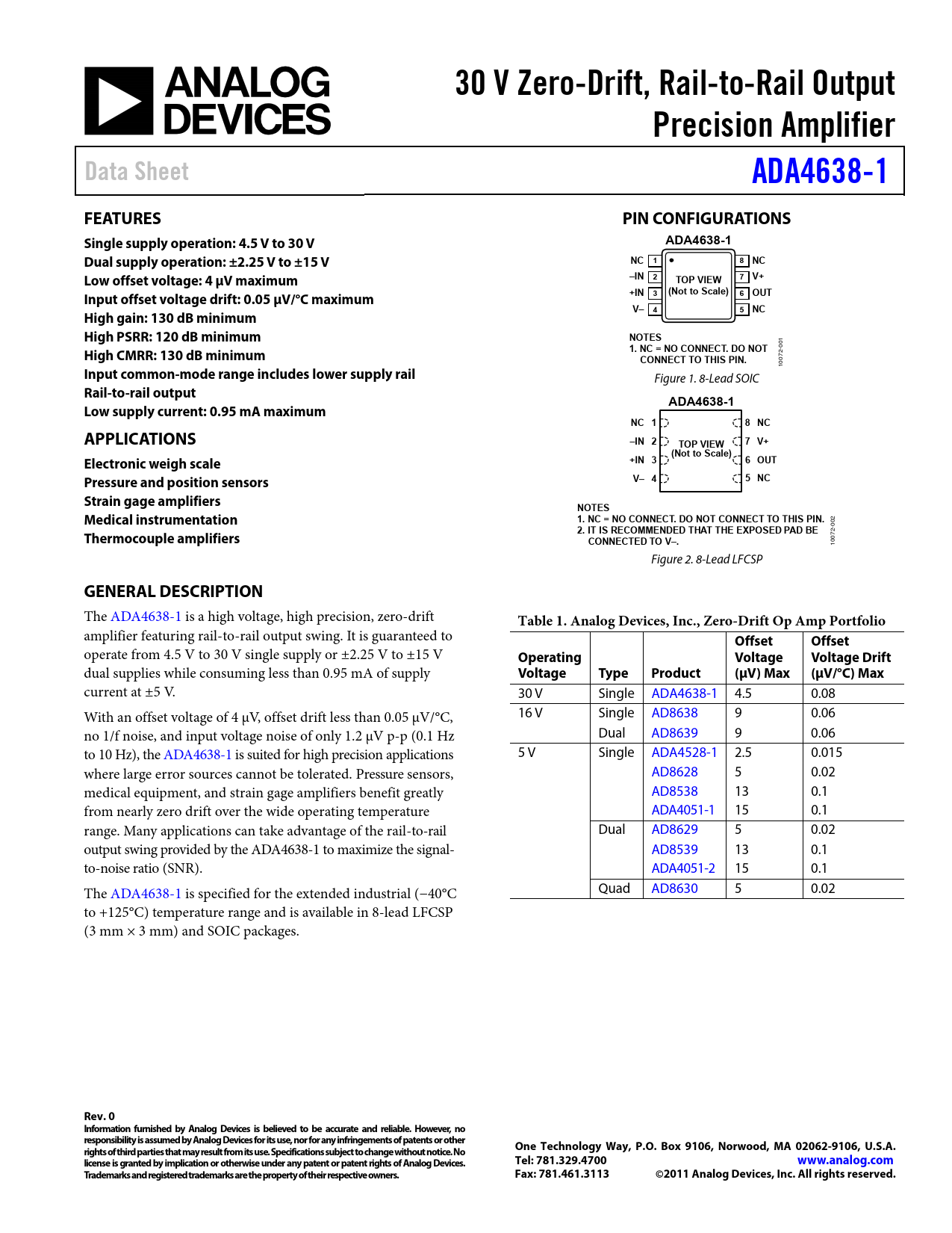 30 V Zero-Drift, Rail-to-Rail Output. Precision Amplifier. Data Sheet. ADA4638-1. FEATURES. PIN CONFIGURATIONS