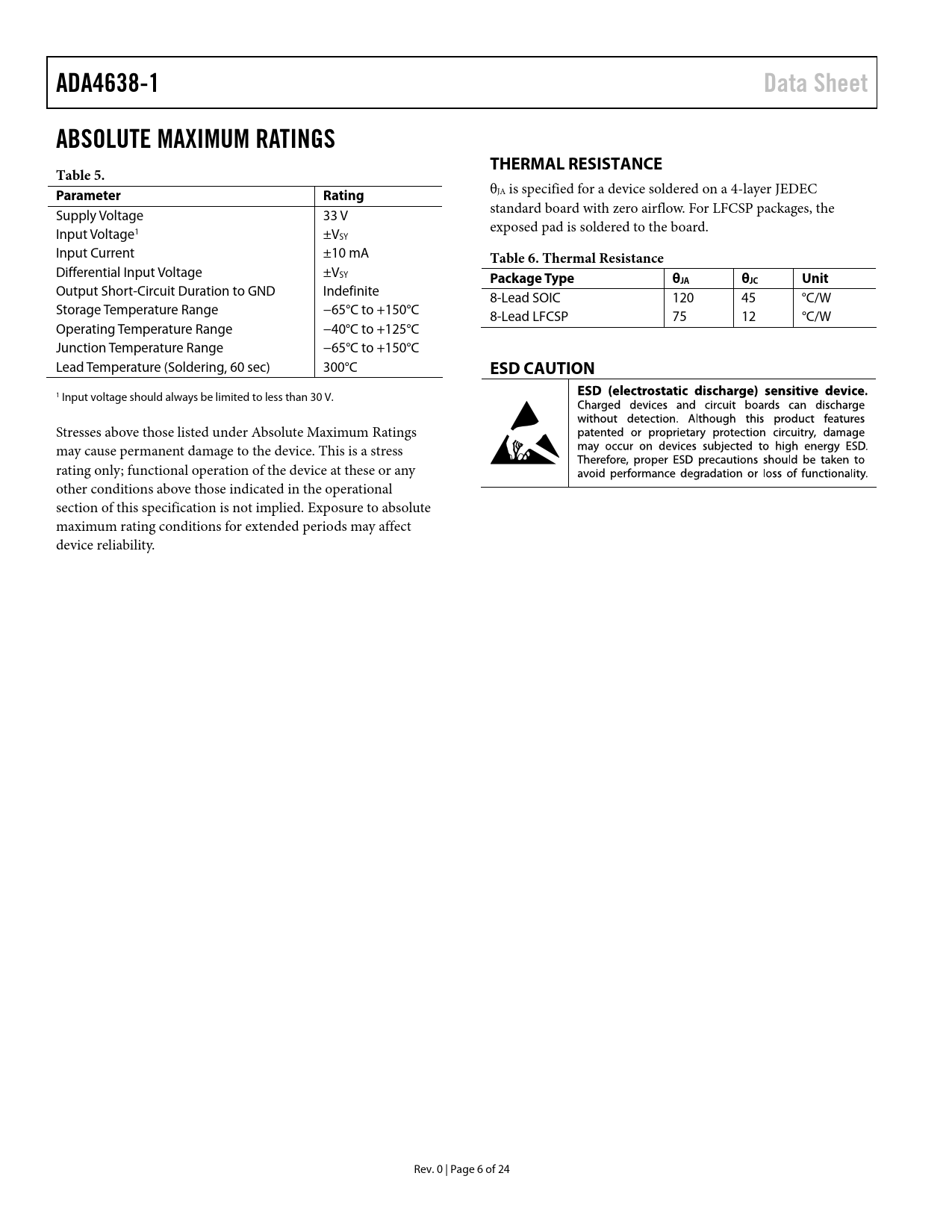 ADA4638-1 Data Sheet ABSOLUTE MAXIMUM RATINGS THERMAL RESISTANCE Table 5 Parameter Rating Table 6 Thermal Resistance