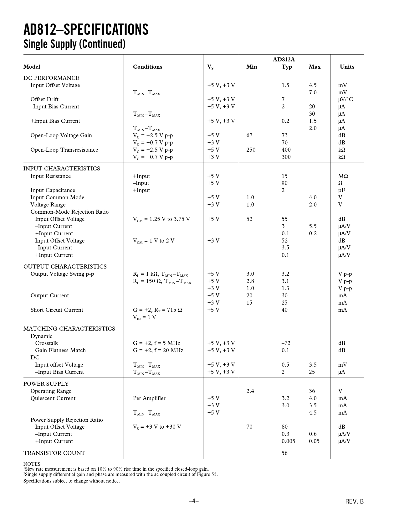 AD812–SPECIFICATIONS Single Supply (Continued)AD812AModelConditionsVMinTypMaxUnitsS DC PERFORMANCE Input Offset Voltage +5 V, +3 V 1.5 4.5 mV T –T 7.0 mV MIN MAX Offset Drift +5 V, +3 V 7 µV/°C –Input Bias Current +5 V, +3 V 2 20 µA T –T 30 µA MIN MAX +Input Bias Current +5 V, +3 V 0.2 1.5 µA T –T 2.0 µA MIN MAX Open-Loop Voltage Gain V = +2.5 V p-p +5 V 67 73 dB O V = +0.7 V p-p +3 V 70 dB O Open-Loop Transresistance V = +2.5 V p-p +5 V 250 400 kΩ O V = +0.7 V p-p +3 V 300 kΩ O INPUT CHARACTERISTICS Input Resistance +Input +5 V 15 MΩ –Input +5 V 90 Ω Input Capacitance +Input 2 pF Input Common Mode +5 V 1.0 4.0 V Voltage Range +3 V 1.0 2.0 V Common-Mode Rejection Ratio Input Offset Voltage V = 1.25 V to 3.75 V +5 V 52 55 dB CM –Input Current 3 5.5 µA/V +Input Current 0.1 0.2 µA/V Input Offset Voltage V = 1 V to 2 V +3 V 52 dB CM –Input Current 3.5 µA/V +Input Current 0.1 µA/V OUTPUT CHARACTERISTICS Output Voltage Swing p-p R = 1 kΩ, T –T +5 V 3.0 3.2 V p-p L MIN MAX R = 150 Ω, T –T +5 V 2.8 3.1 V p-p L MIN MAX +3 V 1.0 1.3 V p-p Output Current +5 V 20 30 mA +3 V 15 25 mA Short Circuit Current G = +2, R = 715 Ω +5 V 40 mA F V = 1 V IN MATCHING CHARACTERISTICS Dynamic Crosstalk G = +2, f = 5 MHz +5 V, +3 V –72 dB Gain Flatness Match G = +2, f = 20 MHz +5 V, +3 V 0.1 dB DC Input offset Voltage T –T +5 V, +3 V 0.5 3.5 mV MIN MAX –Input Bias Current T –T +5 V, +3 V 2 25 µA MIN MAX POWER SUPPLY Operating Range 2.4 36 V Quiescent Current Per Amplifier +5 V 3.2 4.0 mA +3 V 3.0 3.5 mA T –T +5 V 4.5 mA MIN MAX Power Supply Rejection Ratio Input Offset Voltage V = +3 V to +30 V 70 80 dB S –Input Current 0.3 0.6 µA/V +Input Current 0.005 0.05 µA/V TRANSISTOR COUNT 56 NOTES 1Slew rate measurement is based on 10% to 90% rise time in the specified closed-loop gain. 2Single supply differential gain and phase are measured with the ac coupled circuit of Figure 53. Specifications subject to change without notice. –4– REV. B