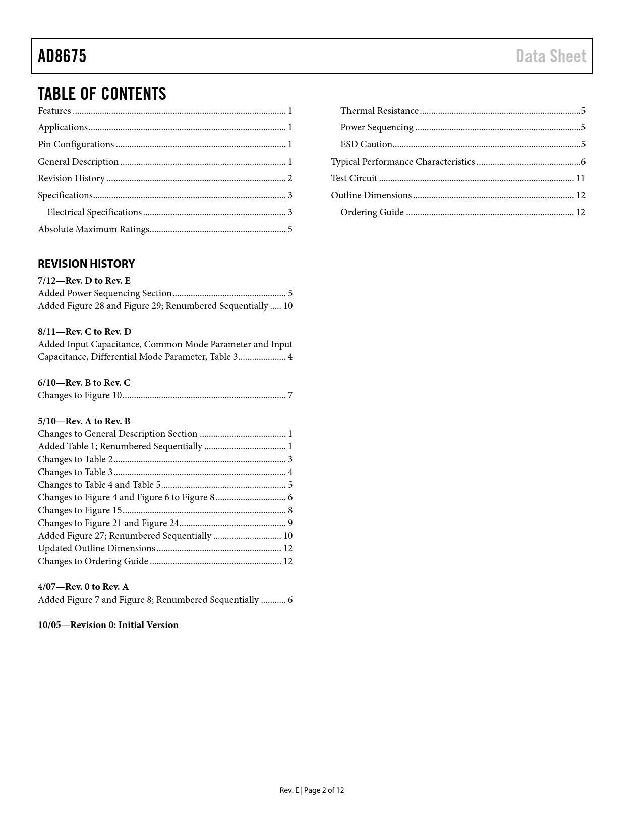 AD8675. Data Sheet. TABLE OF CONTENTS. REVISION HISTORY 7/12—Rev. D to Rev. E. 8/11—Rev. C to Rev. D. 6/10—Rev. B to Rev. C