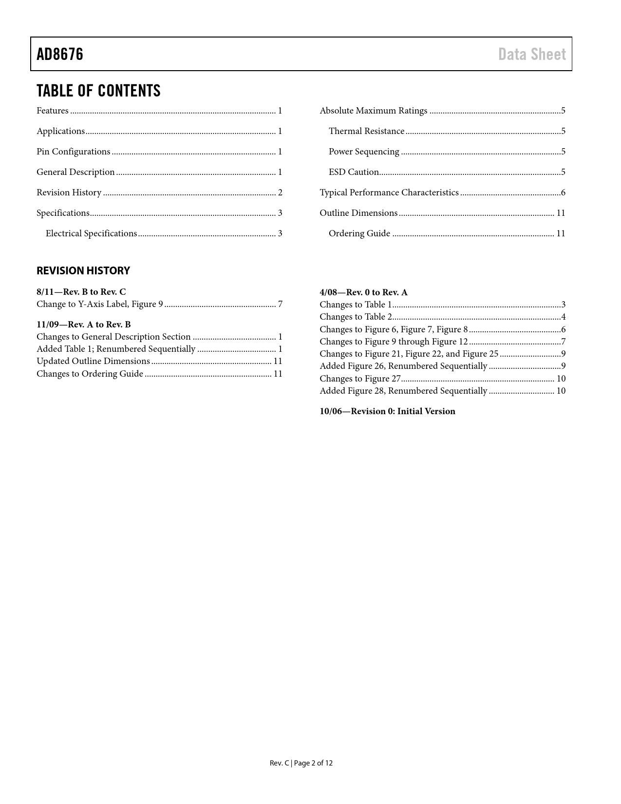 link to page 1 link to page 1 link to page 1 link to page 1 link to page 2 link to page 3 link to page 3 link to page 5 link to page 5 link to page 5 link to page 5 link to page 6 link to page 11 link to page 11 AD8676Data SheetTABLE OF CONTENTS Features .. 1 Absolute Maximum Ratings ..5 Applications ... 1 Thermal Resistance ...5 Pin Configurations ... 1 Power Sequencing ...5 General Description ... 1 ESD Caution...5 Revision History ... 2 Typical Performance Characteristics ..6 Specifications ... 3 Outline Dimensions ... 11 Electrical Specifications ... 3 Ordering Guide .. 11 REVISION HISTORY8/11—Rev. B to Rev. C4/08—Rev. 0 to Rev. A Change to Y-Axis Label, Figure 9 ... 7 Changes to Table 1 ... 3 Changes to Table 2 ... 4 11/09—Rev. A to Rev. B Changes to Figure 6, Figure 7, Figure 8 .. 6 Changes to General Description Section .. 1 Changes to Figure 9 through Figure 12 .. 7 Added Table 1; Renumbered Sequentially .. 1 Changes to Figure 21, Figure 22, and Figure 25 .. 9 Updated Outline Dimensions ... 11 Added Figure 26, Renumbered Sequentially ... 9 Changes to Ordering Guide .. 11 Changes to Figure 27 .. 10 Added Figure 28, Renumbered Sequentially .. 10 10/06—Revision 0: Initial Version Rev. C | Page 2 of 12 Document Outline FEATURES APPLICATIONS PIN CONFIGURATIONS GENERAL DESCRIPTION TABLE OF CONTENTS REVISION HISTORY SPECIFICATIONS ELECTRICAL SPECIFICATIONS ABSOLUTE MAXIMUM RATINGS THERMAL RESISTANCE POWER SEQUENCING ESD CAUTION TYPICAL PERFORMANCE CHARACTERISTICS OUTLINE DIMENSIONS ORDERING GUIDE