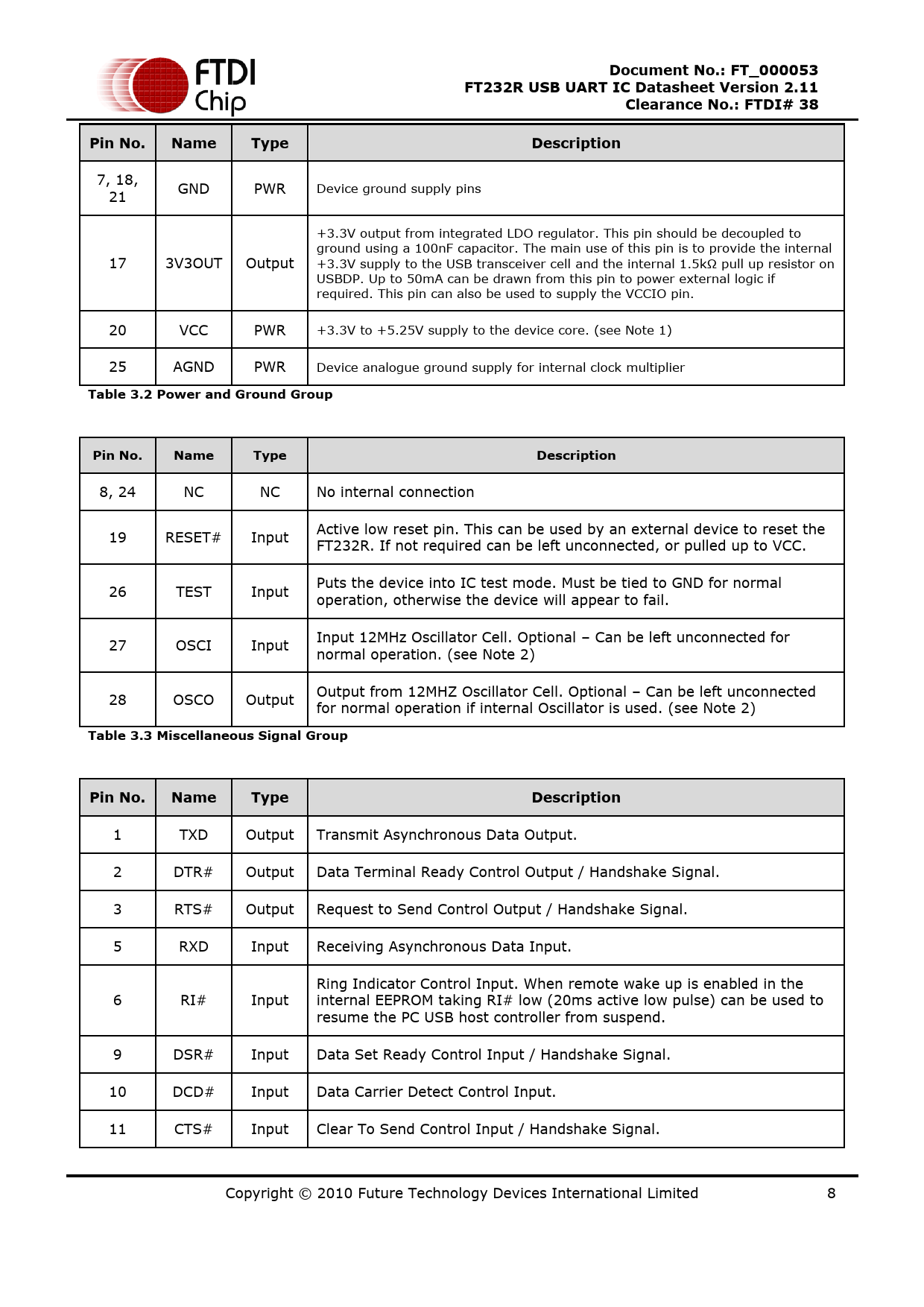 Document No.: FT_000053. FT232R USB UART IC Datasheet Version 2.11. Clearance No.: FTDI# 38. Pin No. Name. Type. Description
