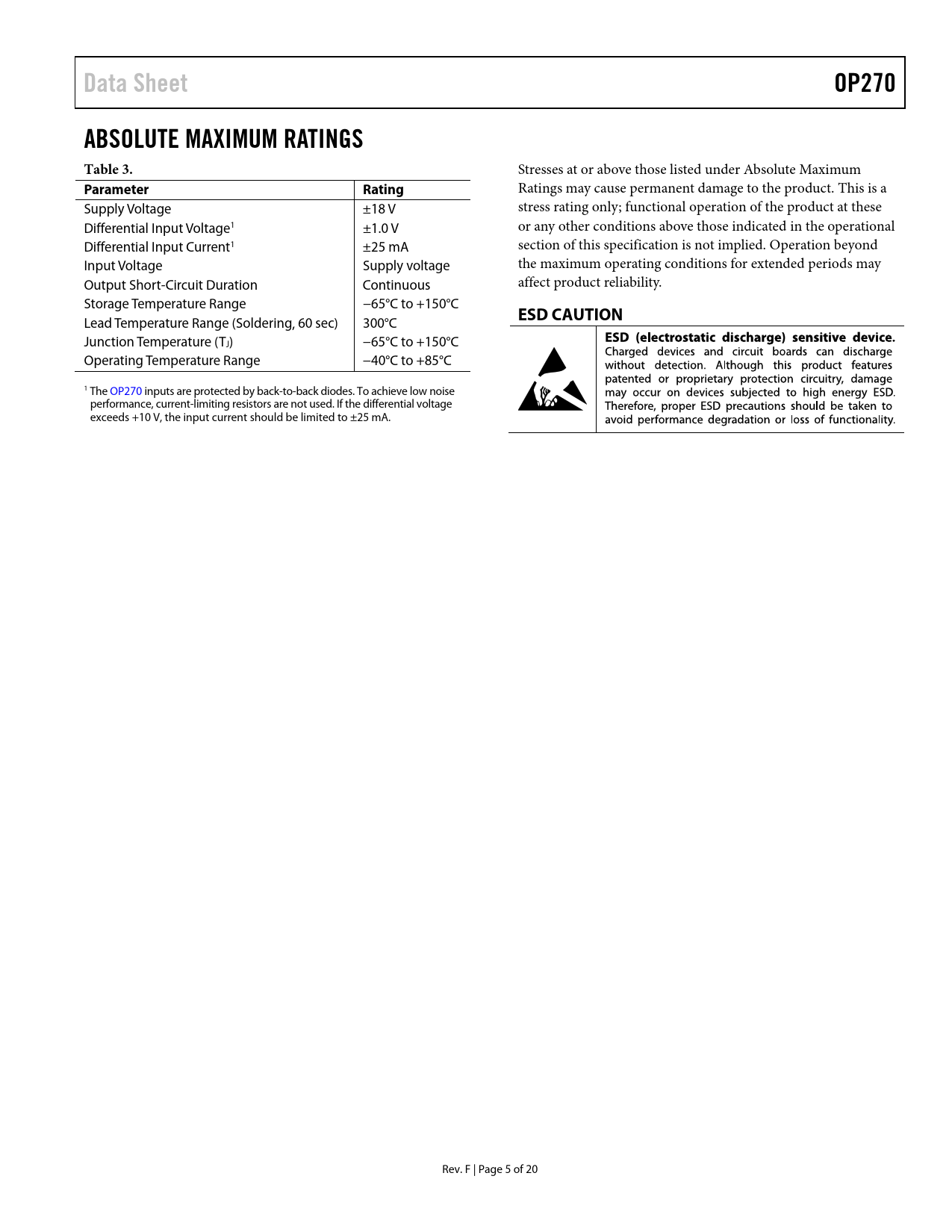 Data Sheet OP270 ABSOLUTE MAXIMUM RATINGS Table 3 Parameter Rating ESD CAUTION