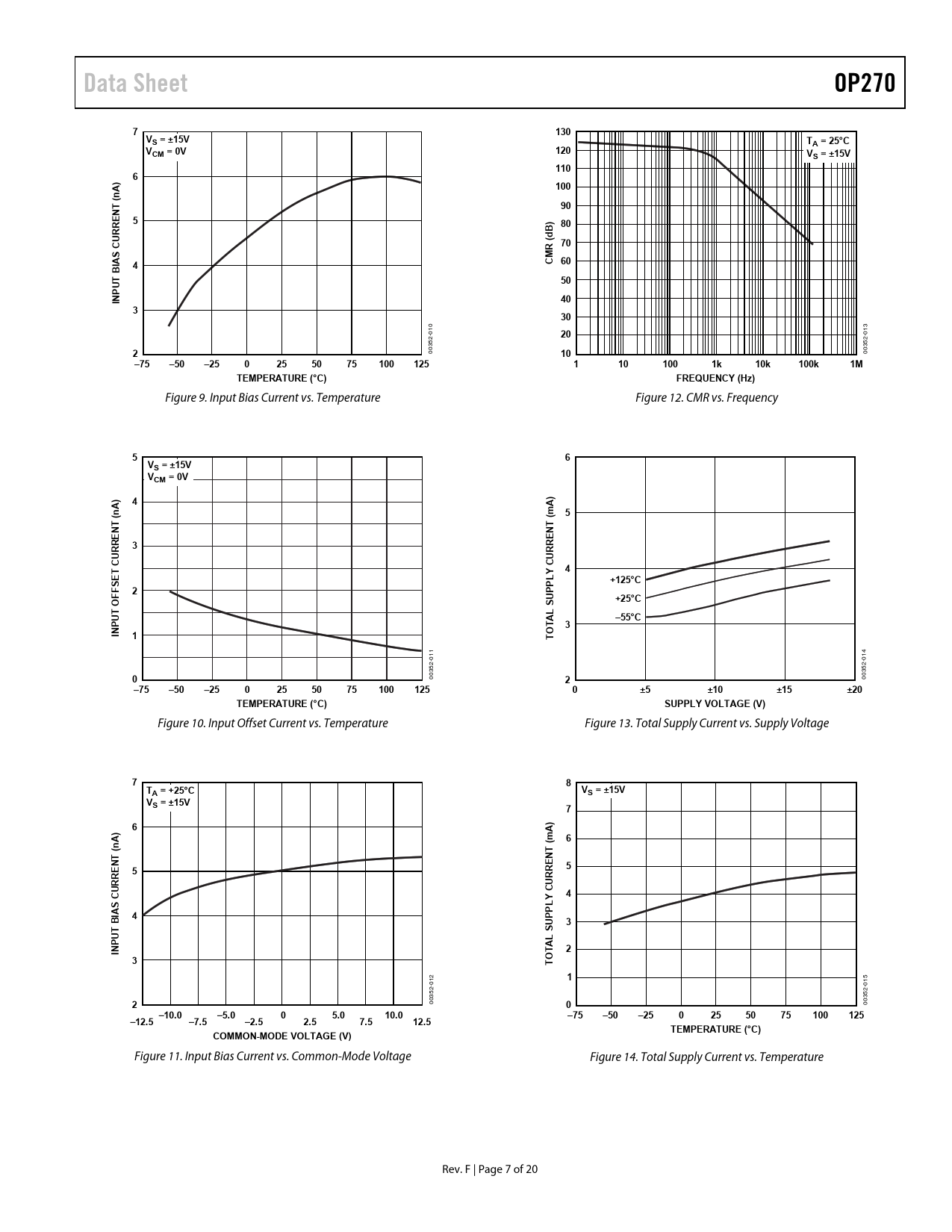 Data Sheet. OP270. 130. VS = ±15V. TA = 25°C. VCM = 0V. 120. 110. 100. n ( T. URRE. d 70. R (. CM 60. BI UT. INP. –75. –50. –25. 125. 10k. 100k. TEMPERATURE (°C)