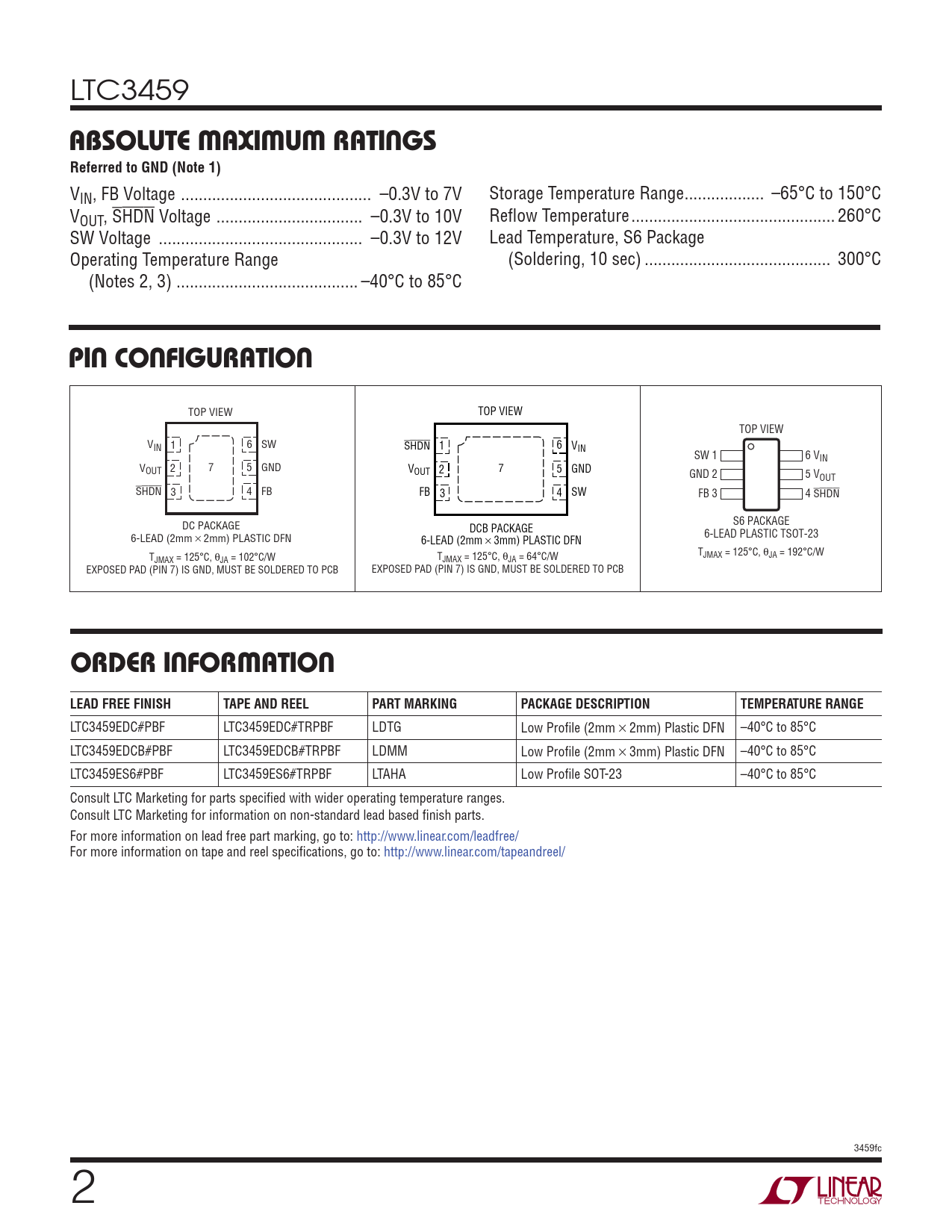 LTC3459EDC#PBF LTC3459EDC#TRPBF LDTG Low Profi le (2mm × 2mm) Plastic DFN –40°C to 85°C LTC3459EDCB#PBF LTC3459EDCB#TRPBF LDMM Low Profi le (2mm × 3mm) Plastic DFN –40°C to 85°C LTC3459ES6#PBF LTC3459ES6#TRPBF LTAHA Low Profi le SOT-23 –40°C to 85°C Consult LTC Marketing for parts specifi ed with wider operating temperature ranges. Consult LTC Marketing for information on non-standard lead based fi nish parts. For more information on lead free part marking, go to: http://www.linear.com/leadfree/ For more information on tape and reel specifi cations, go to: http://www.linear.com/tapeandreel/ 3459fc 2
