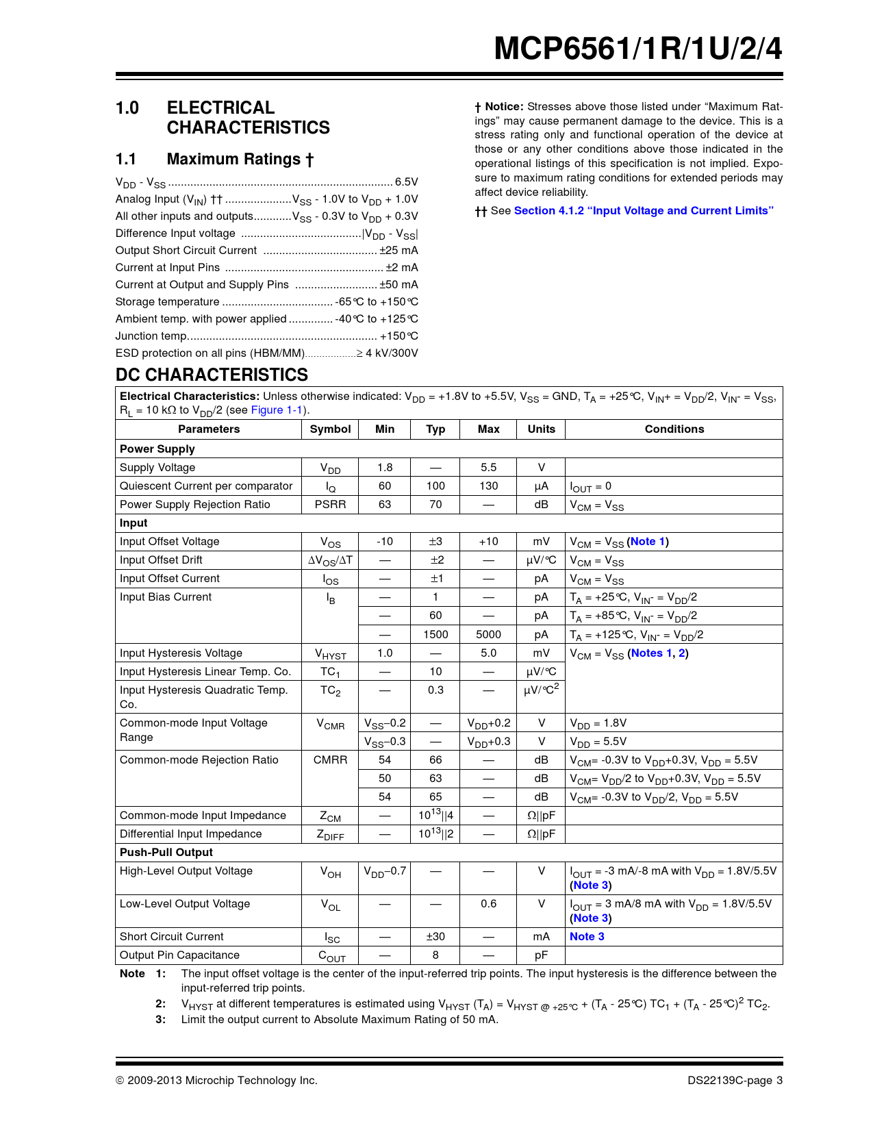 MCP6561/1R/1U/2/4. 1.0. ELECTRICAL. † Notice:. CHARACTERISTICS. 1.1. Maximum Ratings †