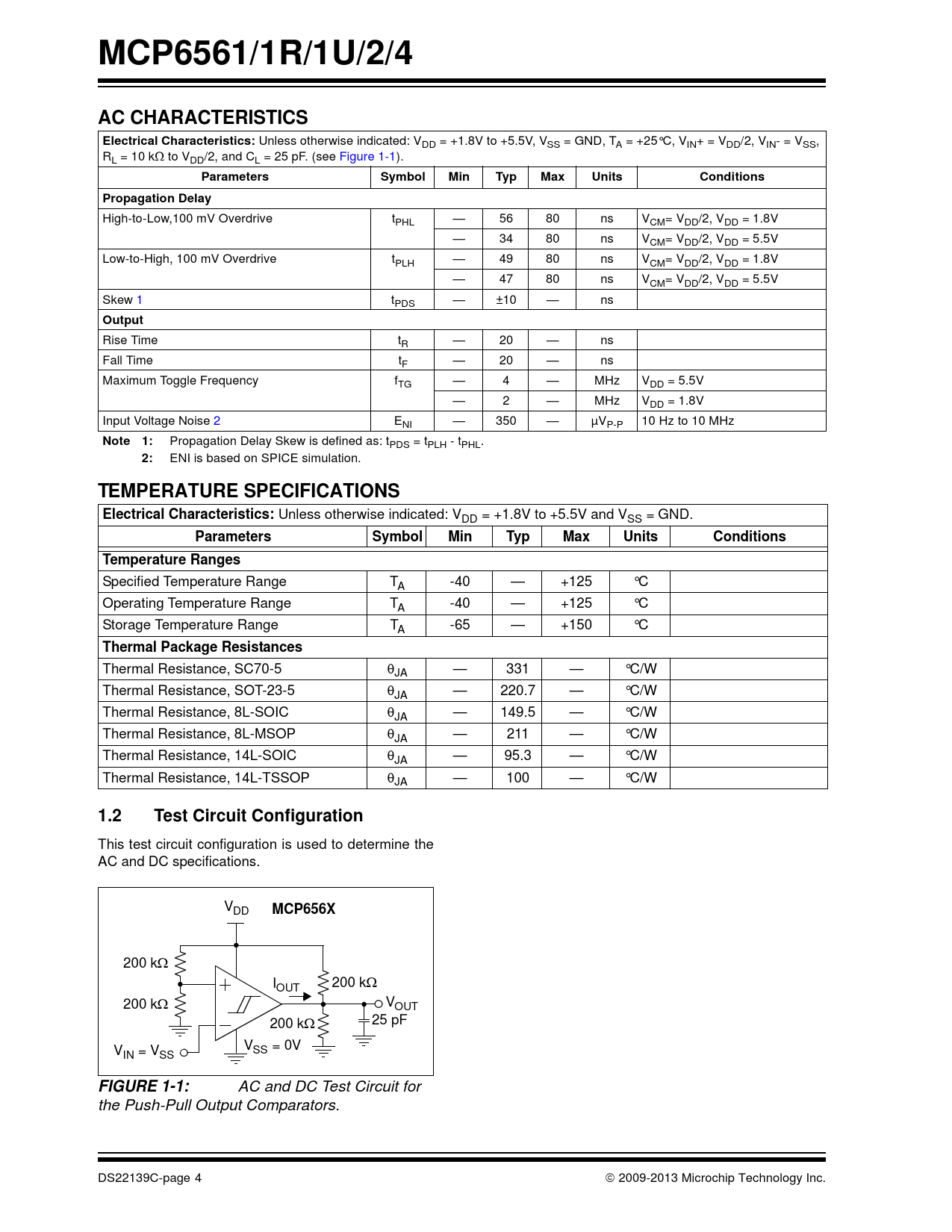 link to page 4 link to page 4 link to page 4 MCP6561/1R/1U/2/4AC CHARACTERISTICSElectrical Characteristics: Unless otherwise indicated: VDD = +1.8V to +5.5V, VSS = GND, TA = +25°C, VIN+ = VDD/2, VIN- = VSS, RL = 10 k to VDD/2, and CL = 25 pF. (see Figure 1-1). ParametersSymbolMinTypMaxUnitsConditionsPropagation Delay High-to-Low,100 mV Overdrive tPHL — 56 80 ns VCM= VDD/2, VDD = 1.8V — 34 80 ns VCM= VDD/2, VDD = 5.5V Low-to-High, 100 mV Overdrive tPLH — 49 80 ns VCM= VDD/2, VDD = 1.8V — 47 80 ns VCM= VDD/2, VDD = 5.5V Skew 1 tPDS — ±10 — ns Output Rise Time tR — 20 — ns Fall Time tF — 20 — ns Maximum Toggle Frequency fTG — 4 — MHz VDD = 5.5V — 2 — MHz VDD = 1.8V Input Voltage Noise 2 ENI — 350 — µVP-P 10 Hz to 10 MHz Note1: Propagation Delay Skew is defined as: tPDS = tPLH - tPHL. 2: ENI is based on SPICE simulation. TEMPERATURE SPECIFICATIONSElectrical Characteristics: Unless otherwise indicated: VDD = +1.8V to +5.5V and VSS = GND. ParametersSymbolMinTypMaxUnitsConditionsTemperature Ranges Specified Temperature Range TA -40 — +125 °C Operating Temperature Range TA -40 — +125 °C Storage Temperature Range TA -65 — +150 °C Thermal Package Resistances Thermal Resistance, SC70-5 JA — 331 — °C/W Thermal Resistance, SOT-23-5 JA — 220.7 — °C/W Thermal Resistance, 8L-SOIC JA — 149.5 — °C/W Thermal Resistance, 8L-MSOP JA — 211 — °C/W Thermal Resistance, 14L-SOIC JA — 95.3 — °C/W Thermal Resistance, 14L-TSSOP JA — 100 — °C/W 1.2Test Circuit Configuration This test circuit configuration is used to determine the AC and DC specifications. VDD MCP656X 200 k I 200 k OUT 200 k VOUT 200 k 25 pF V V SS = 0V IN = VSS FIGURE 1-1: AC and DC Test Circuit for the Push-Pull Output Comparators. DS22139C-page 4 2009-2013 Microchip Technology Inc. Document Outline MCP6561/1R/1U/2/4 1.0 Electrical Characteristics 1.1 Maximum Ratings 1.2 Test Circuit Configuration FIGURE 1-1: AC and DC Test Circuit for the Push-Pull Output Comparators. 2.0 Typical Performance Curves FIGURE 2-1: Input Offset Voltage. FIGURE 2-2: Input Offset Voltage Drift. FIGURE 2-3: Input vs. Output Signal, No Phase Reversal. FIGURE 2-4: Input Hysteresis Voltage. FIGURE 2-5: Input Hysteresis Voltage Drift - Linear Temp. Co. (TC1). FIGURE 2-6: Input Hysteresis Voltage Drift - Quadratic Temp. Co. (TC2). FIGURE 2-7: Input Offset Voltage vs. Temperature. FIGURE 2-8: Input Offset Voltage vs. Common-mode Input Voltage. FIGURE 2-9: Input Offset Voltage vs. Common-mode Input Voltage. FIGURE 2-10: Input Hysteresis Voltage vs. Temperature. FIGURE 2-11: Input Hysteresis Voltage vs. Common-mode Input Voltage. FIGURE 2-12: Input Hysteresis Voltage vs. Common-mode Input Voltage. FIGURE 2-13: Input Offset Voltage vs. Supply Voltage vs. Temperature. FIGURE 2-14: Quiescent Current. FIGURE 2-15: Quiescent Current vs. Common-mode Input Voltage. FIGURE 2-16: Input Hysteresis Voltage vs. Supply Voltage vs. Temperature. FIGURE 2-17: Quiescent Current vs. Supply Voltage vs Temperature. FIGURE 2-18: Quiescent Current vs. Common-mode Input Voltage. FIGURE 2-19: Quiescent Current vs. Toggle Frequency. FIGURE 2-20: Output Headroom vs. Output Current. FIGURE 2-21: Low-to-High and High-to- Low Propagation Delays. FIGURE 2-22: Short Circuit Current vs. Supply Voltage vs. Temperature. FIGURE 2-23: Output Headroom vs.Output Current. FIGURE 2-24: Low-to-High and High-to- Low Propagation Delays . FIGURE 2-25: Propagation Delay Skew. FIGURE 2-26: Propagation Delay vs. Supply Voltage. FIGURE 2-27: Propagation Delay vs. Common-mode Input Voltage. FIGURE 2-28: Propagation Delay vs. Temperature. FIGURE 2-29: Propagation Delay vs. Input Over-Drive. FIGURE 2-30: Propagation Delay vs. Common-mode Input Voltage. FIGURE 2-31: Propagation Delay vs. Capacitive Load. FIGURE 2-32: Input Bias Current vs. Input Voltage vs Temperature. FIGURE 2-33: Common-mode Rejection Ratio and Power Supply Rejection Ratio vs. Temperature. FIGURE 2-34: Power Supply Rejection Ratio (PSRR). FIGURE 2-35: Common-mode Rejection Ratio (CMRR). FIGURE 2-36: Common-mode Rejection Ratio (CMRR). FIGURE 2-37: Output Jitter vs. Input Frequency. FIGURE 2-38: Input Offset Current and Input Bias Current vs. Temperature. FIGURE 2-39: Input Offset Current and Input Bias Current vs. Common-mode Input Voltage vs. Temperature. 3.0 Pin Descriptions TABLE 3-1: Pin Function Table 3.1 Analog Inputs 3.2 Digital Outputs 3.3 Power Supply (VSS and VDD) 4.0 Applications Information 4.1 Comparator Inputs 4.1.1 Normal Operation FIGURE 4-1: The MCP6561/1R/1U/2/4 Comparators’ Internal Hysteresis Eliminates Output Chatter Caused by Input Noise Voltage. 4.1.2 Input Voltage and Current Limits FIGURE 4-2: Simplified Analog Input ESD Structures. FIGURE 4-3: Protecting the Analog Inputs. 4.1.3 Phase Reversal 4.2 Push-Pull Output 4.3 Externally Set Hysteresis 4.3.1 Non-Inverting Circuit FIGURE 4-4: Non-inverting Circuit with Hysteresis for Single-Supply. FIGURE 4-5: Hysteresis Diagram for the Non-inverting Circuit. 4.3.2 Inverting Circuit FIGURE 4-6: Inverting Circuit With Hysteresis. FIGURE 4-7: Hysteresis Diagram for the Inverting Circuit. FIGURE 4-8: Thevenin Equivalent Circuit. 4.4 Bypass Capacitors 4.5 Capacitive Loads 4.6 PCB Surface Leakage FIGURE 4-9: Example Guard Ring Layout for Inverting Circuit. 4.7 PCB Layout Technique FIGURE 4-10: Recommended Layout. 4.8 Unused Comparators FIGURE 4-11: Unused Comparators. 4.9 Typical Applications 4.9.1 Precise Comparator FIGURE 4-12: Precise Inverting Comparator. 4.9.2 Windowed Comparator FIGURE 4-13: Windowed Comparator. 4.9.3 Bistable Multivibrator FIGURE 4-14: Bistable Multivibrator. 5.0 Design Aids 5.1 Microchip Advanced Part Selector (MAPS) 5.2 Analog Demonstration and Evaluation Boards 5.3 Application Notes 6.0 Packaging Information 6.1 Package Marking Information Appendix A: Revision History Product Identification System Trademarks Worldwide Sales and Service