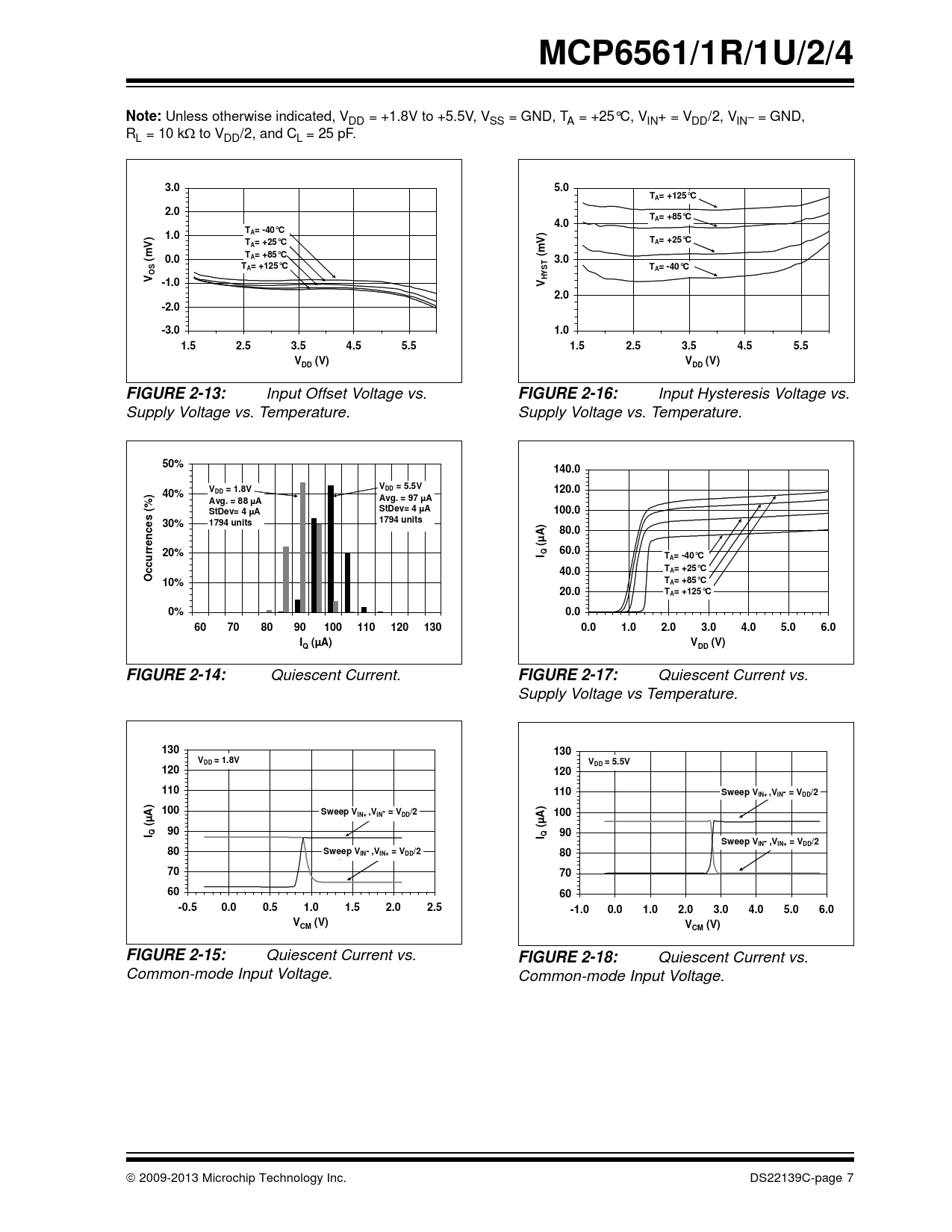 130 130 VDD = 1.8V VDD = 5.5V 120 120 110 110 Sweep VIN+ ,VIN- = VDD/2 ) ) A 100 Swe Sw ep eep V - = V /2 IN+ ,V IN- = VDD A 100 (µ 90 (µ I Q 90 I Q Sweep VIN- ,VIN+ = VDD/2 80 Swee e p V p IN- ,V IN- , IN V + = IN+ = VDD/2 80 / 70 70 60 60 -0.5 0.0 0.5 1.0 1.5 2.0 2.5 -1.0 0.0 1.0 2.0 3.0 4.0 5.0 6.0 VCM (V) VCM (V) FIGURE 2-15: