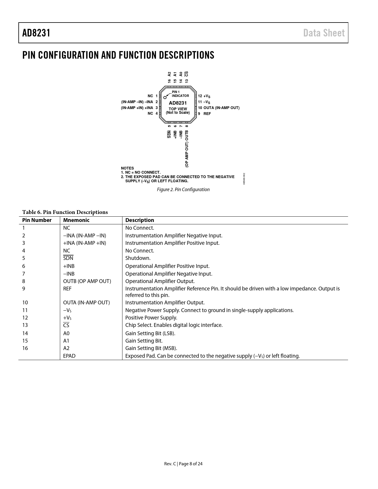 Seiten / Seite24 / 8 — AD8231. Data Sheet. PIN CONFIGURATION AND FUNCTION DESCRIPTIONS. PIN 1. …
