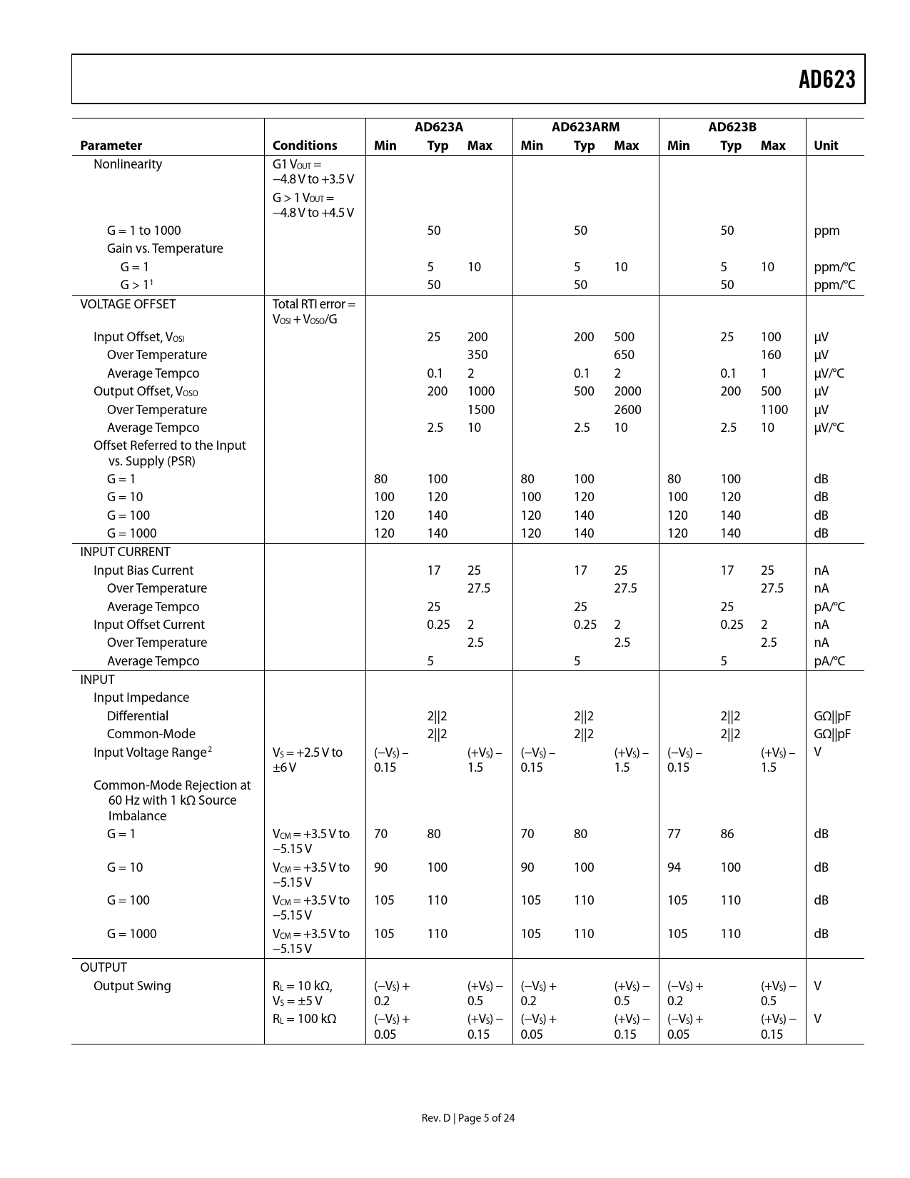 link to page 6 link to page 6 AD623AD623AAD623ARMAD623BParameterConditionsMinTypMaxMinTypMaxMinTypMaxUnit Nonlinearity G1 VOUT = −4.8 V to +3.5 V G > 1 VOUT = −4.8 V to +4.5 V G = 1 to 1000 50 50 50 ppm Gain vs. Temperature G = 1 5 10 5 10 5 10 ppm/°C G > 11 50 50 50 ppm/°C VOLTAGE OFFSET Total RTI error = VOSI + VOSO/G Input Offset, VOSI 25 200 200 500 25 100 μV Over Temperature 350 650 160 μV Average Tempco 0.1 2 0.1 2 0.1 1 μV/°C Output Offset, VOSO 200 1000 500 2000 200 500 μV Over Temperature 1500 2600 1100 μV Average Tempco 2.5 10 2.5 10 2.5 10 μV/°C Offset Referred to the Input vs. Supply (PSR) G = 1 80 100 80 100 80 100 dB G = 10 100 120 100 120 100 120 dB G = 100 120 140 120 140 120 140 dB G = 1000 120 140 120 140 120 140 dB INPUT CURRENT Input Bias Current 17 25 17 25 17 25 nA Over Temperature 27.5 27.5 27.5 nA Average Tempco 25 25 25 pA/°C Input Offset Current 0.25 2 0.25 2 0.25 2 nA Over Temperature 2.5 2.5 2.5 nA Average Tempco 5 5 5 pA/°C INPUT Input Impedance Differential 2||2 2||2 2||2 GΩ||pF Common-Mode 2||2 2||2 2||2 GΩ||pF Input Voltage Range2 VS = +2.5 V to (−VS) – (+VS) – (−VS) – (+VS) – (−VS) – (+VS) – V ±6 V 0.15 1.5 0.15 1.5 0.15 1.5 Common-Mode Rejection at 60 Hz with 1 kΩ Source Imbalance G = 1 VCM = +3.5 V to 70 80 70 80 77 86 dB −5.15 V G = 10 VCM = +3.5 V to 90 100 90 100 94 100 dB −5.15 V G = 100 VCM = +3.5 V to 105 110 105 110 105 110 dB −5.15 V G = 1000 VCM = +3.5 V to 105 110 105 110 105 110 dB −5.15 V OUTPUT Output Swing RL = 10 kΩ, (−VS) + (+VS) − (−VS) + (+VS) − (−VS) + (+VS) − V VS = ±5 V 0.2 0.5 0.2 0.5 0.2 0.5 RL = 100 kΩ (−VS) + (+VS) − (−VS) + (+VS) − (−VS) + (+VS) − V 0.05 0.15 0.05 0.15 0.05 0.15 Rev. D | Page 5 of 24 Document Outline FEATURES APPLICATIONS GENERAL DESCRIPTION CONNECTION DIAGRAM TABLE OF CONTENTS REVISION HISTORY SPECIFICATIONS SINGLE SUPPLY DUAL SUPPLIES BOTH DUAL AND SINGLE SUPPLIES ABSOLUTE MAXIMUM RATINGS ESD CAUTION TYPICAL PERFORMANCE CHARACTERISTICS THEORY OF OPERATION APPLICATIONS INFORMATION BASIC CONNECTION GAIN SELECTION REFERENCE TERMINAL INPUT AND OUTPUT OFFSET VOLTAGE INPUT PROTECTION RF INTERFERENCE GROUNDING Ground Returns for Input Bias Currents Output Buffering Single-Supply Data Acquisition System Amplifying Signals with Low Common-Mode Voltage INPUT DIFFERENTIAL AND COMMON-MODE RANGE vs. SUPPLY AND GAIN OUTLINE DIMENSIONS ORDERING GUIDE