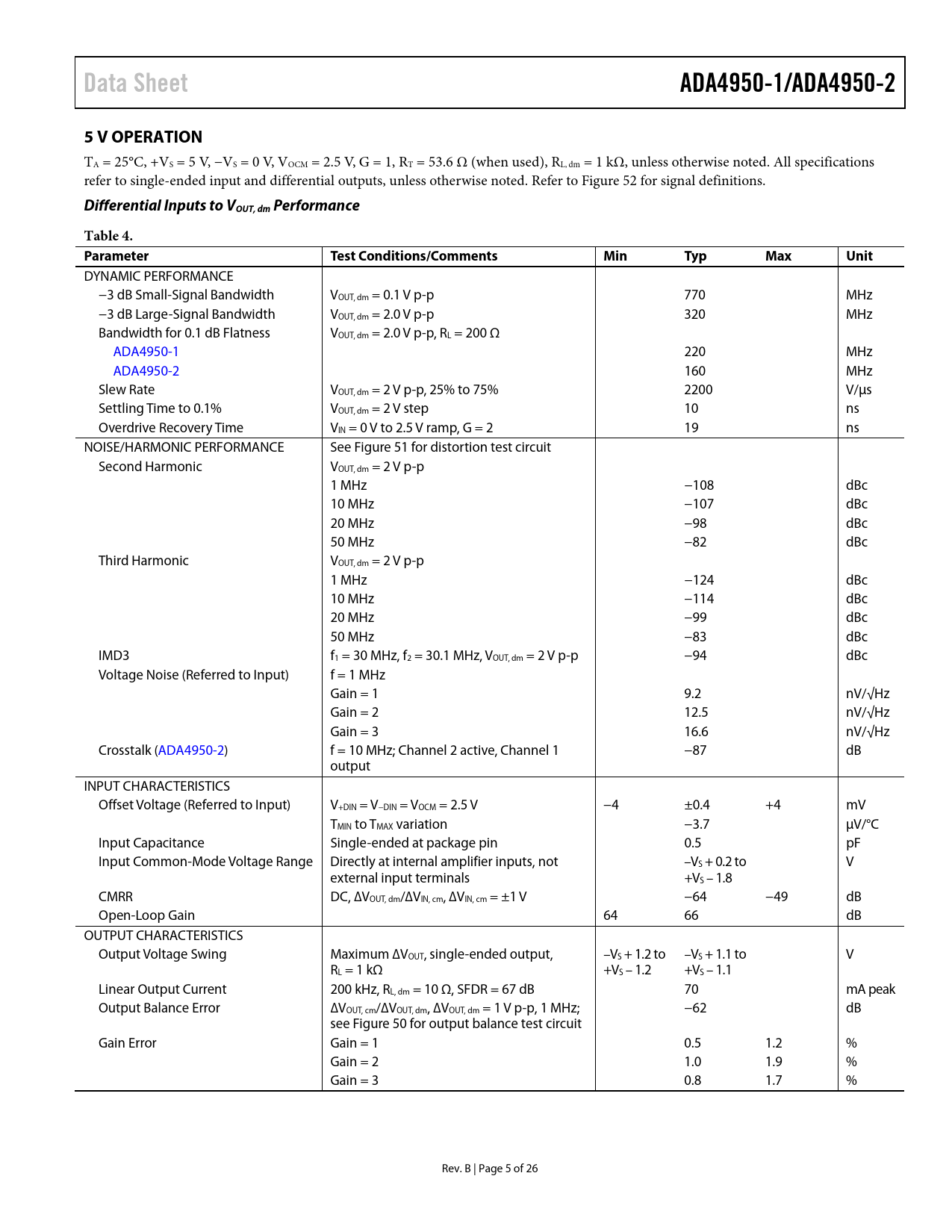 link to page 17 link to page 16 link to page 16 Data SheetADA4950-1/ADA4950-25 V OPERATION TA = 25°C, +VS = 5 V, −VS = 0 V, VOCM = 2.5 V, G = 1, RT = 53.6 Ω (when used), RL, dm = 1 kΩ, unless otherwise noted. All specifications refer to single-ended input and differential outputs, unless otherwise noted. Refer to Figure 52 for signal definitions. Differential Inputs to VOUT, dm PerformanceTable 4. ParameterTest Conditions/CommentsMinTypMaxUnit DYNAMIC PERFORMANCE −3 dB Small-Signal Bandwidth VOUT, dm = 0.1 V p-p 770 MHz −3 dB Large-Signal Bandwidth VOUT, dm = 2.0 V p-p 320 MHz Bandwidth for 0.1 dB Flatness VOUT, dm = 2.0 V p-p, RL = 200 Ω ADA4950-1 220 MHz ADA4950-2 160 MHz Slew Rate VOUT, dm = 2 V p-p, 25% to 75% 2200 V/µs Settling Time to 0.1% VOUT, dm = 2 V step 10 ns Overdrive Recovery Time VIN = 0 V to 2.5 V ramp, G = 2 19 ns NOISE/HARMONIC PERFORMANCE See Figure 51 for distortion test circuit Second Harmonic VOUT, dm = 2 V p-p 1 MHz −108 dBc 10 MHz −107 dBc 20 MHz −98 dBc 50 MHz −82 dBc Third Harmonic VOUT, dm = 2 V p-p 1 MHz −124 dBc 10 MHz −114 dBc 20 MHz −99 dBc 50 MHz −83 dBc IMD3 f1 = 30 MHz, f2 = 30.1 MHz, VOUT, dm = 2 V p-p −94 dBc Voltage Noise (Referred to Input) f = 1 MHz Gain = 1 9.2 nV/√Hz Gain = 2 12.5 nV/√Hz Gain = 3 16.6 nV/√Hz Crosstalk (ADA4950-2) f = 10 MHz; Channel 2 active, Channel 1 −87 dB output INPUT CHARACTERISTICS Offset Voltage (Referred to Input) V+DIN = V−DIN = VOCM = 2.5 V −4 ±0.4 +4 mV TMIN to TMAX variation −3.7 µV/°C Input Capacitance Single-ended at package pin 0.5 pF Input Common-Mode Voltage Range Directly at internal amplifier inputs, not –VS + 0.2 to V external input terminals +VS – 1.8 CMRR DC, ∆VOUT, dm/∆VIN, cm, ∆VIN, cm = ±1 V −64 −49 dB Open-Loop Gain 64 66 dB OUTPUT CHARACTERISTICS Output Voltage Swing Maximum ∆VOUT, single-ended output, –VS + 1.2 to –VS + 1.1 to V RL = 1 kΩ +VS – 1.2 +VS – 1.1 Linear Output Current 200 kHz, RL, dm = 10 Ω, SFDR = 67 dB 70 mA peak Output Balance Error ∆VOUT, cm/∆VOUT, dm, ∆VOUT, dm = 1 V p-p, 1 MHz; −62 dB see Figure 50 for output balance test circuit Gain Error Gain = 1 0.5 1.2 % Gain = 2 1.0 1.9 % Gain = 3 0.8 1.7 % Rev. B | Page 5 of 26 Document Outline Features Applications General Description Functional Block Diagrams Table of Contents Revision History Specifications ±5 V Operation Differential Inputs to VOUT, dm Performance VOCM to VOUT, cm Performance General Performance 5 V Operation Differential Inputs to VOUT, dm Performance VOCM to VOUT, cm Performance General Performance Absolute Maximum Ratings Thermal Resistance Maximum Power Dissipation ESD Caution Pin Configurations and Function Descriptions Typical Performance Characteristics Test Circuits Terminology Theory of Operation Applications Information Analyzing an Application Circuit Selecting the Closed-Loop Gain Estimating the Output Noise Voltage Calculating the Input Impedance for an Application Circuit Terminating a Single-Ended Input Input Common-Mode Voltage Range Input and Output Capacitive AC Coupling Input Signal Swing Considerations Setting the Output Common-Mode Voltage Layout, Grounding, and Bypassing High Performance ADC Driving Outline Dimensions Ordering Guide
