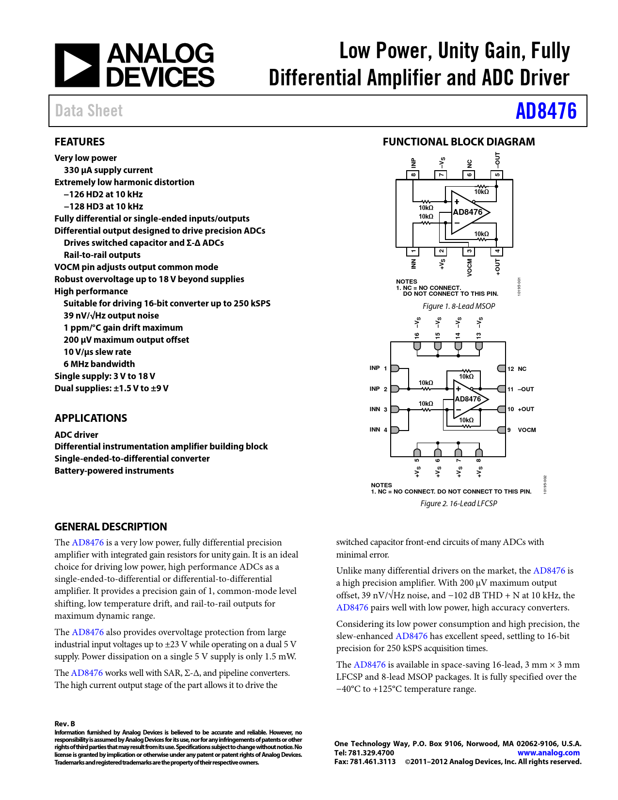 Low Power, Unity Gain, Ful y. Differential Amplifier and ADC Driver. Data Sheet. AD8476. FEATURES. FUNCTIONAL BLOCK DIAGRAM