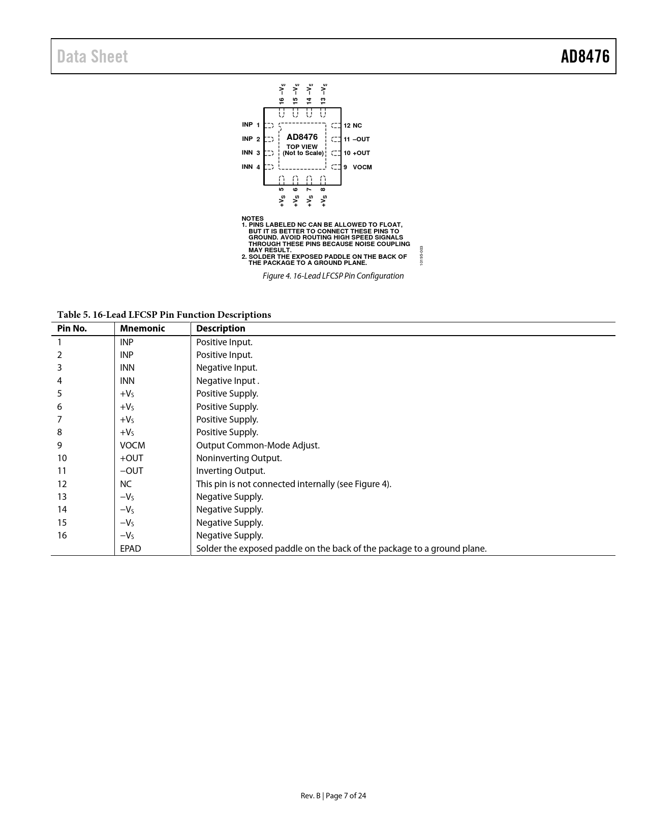 1 INP Positive Input. 2 INP Positive Input. 3 INN Negative Input. 4 INN Negative Input . 5 +VS Positive Supply. 6 +VS Positive Supply. 7 +VS Positive Supply. 8 +VS Positive Supply. 9 VOCM Output Common-Mode Adjust. 10 +OUT Noninverting Output. 11 −OUT Inverting Output. 12 NC This pin is not connected internally (see Figure 4). 13 −VS Negative Supply. 14 −VS Negative Supply. 15 −VS Negative Supply. 16 −VS Negative Supply. EPAD Solder the exposed paddle on the back of the package to a ground plane. Rev. B | Page 7 of 24 Document Outline Features Applications Functional Block Diagram General Description Revision History Specifications Absolute Maximum Ratings Thermal Resistance Maximum Power Dissipation ESD Caution Pin Configuration and Function Descriptions Typical Performance Characteristics Terminology Theory of Operation Overview Circuit Information Output Common-Mode Voltage (VOCM) DC Precision Input Voltage Range Driving the AD8476 Power Supplies Applications Information Typical Configuration Single-Ended-to-Differential Conversion Setting the Output Common-Mode Voltage Low Power ADC Driving Outline Dimensions Ordering Guide