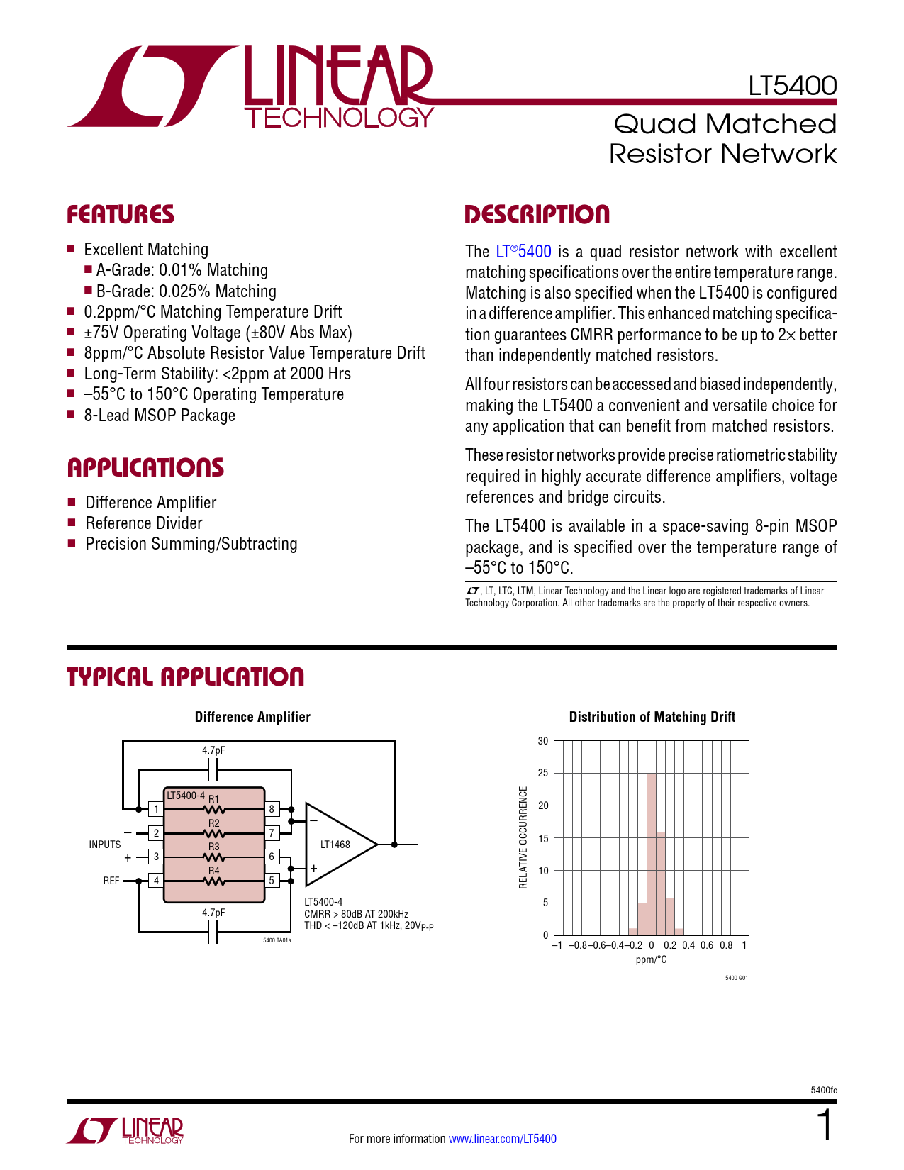 LT5400 Quad Matched Resistor Network FeaTuresDescripTion n Excellent Matching The LT®5400 is a quad resistor network with excellent n A-Grade: 0.01% Matching matching specifications over the entire temperature range. n B-Grade: 0.025% Matching Matching is also specified when the LT5400 is configured n 0.2ppm/°C Matching Temperature Drift in a difference amplifier. This enhanced matching specifica- n ±75V Operating Voltage (±80V Abs Max) tion guarantees CMRR performance to be up to 2× better n 8ppm/°C Absolute Resistor Value Temperature Drift than independently matched resistors. n Long-Term Stability: <2ppm at 2000 Hrs All four resistors can be accessed and biased independently, n –55°C to 150°C Operating Temperature making the LT5400 a convenient and versatile choice for n 8-Lead MSOP Package any application that can benefit from matched resistors. These resistor networks provide precise ratiometric stability applicaTions required in highly accurate difference amplifiers, voltage n references and bridge circuits. Difference Amplifier n Reference Divider The LT5400 is available in a space-saving 8-pin MSOP n Precision Summing /Subtracting package, and is specified over the temperature range of –55°C to 150°C. L, LT, LTC, LTM, Linear Technology and the Linear logo are registered trademarks of Linear Technology Corporation. All other trademarks are the property of their respective owners. Typical applicaTionDifference AmplifierDistribution of Matching Drift 30 4.7pF 25 LT5400-4 R1 1 8 20 R2 – – 2 7 INPUTS 15 R3 LT1468 + 3 6 R4 + 10 REF 4 5 RELATIVE OCCURRENCE LT5400-4 5 4.7pF CMRR > 80dB AT 200kHz THD < –120dB AT 1kHz, 20VP-P 0 5400 TA01a –1 –0.8–0.6–0.4–0.2 0 0.2 0.4 0.6 0.8 1 ppm/°C 5400 G01 5400fc For more information www.linear.com/LT5400 1 Document Outline Features Applications Description Typical Application Absolute Maximum Ratings Pin Configuration Available Options Order Information Electrical Characteristics Typical Performance Characteristics Applications Information Typical Applications Package Description Revision History Typical Application Related Parts
