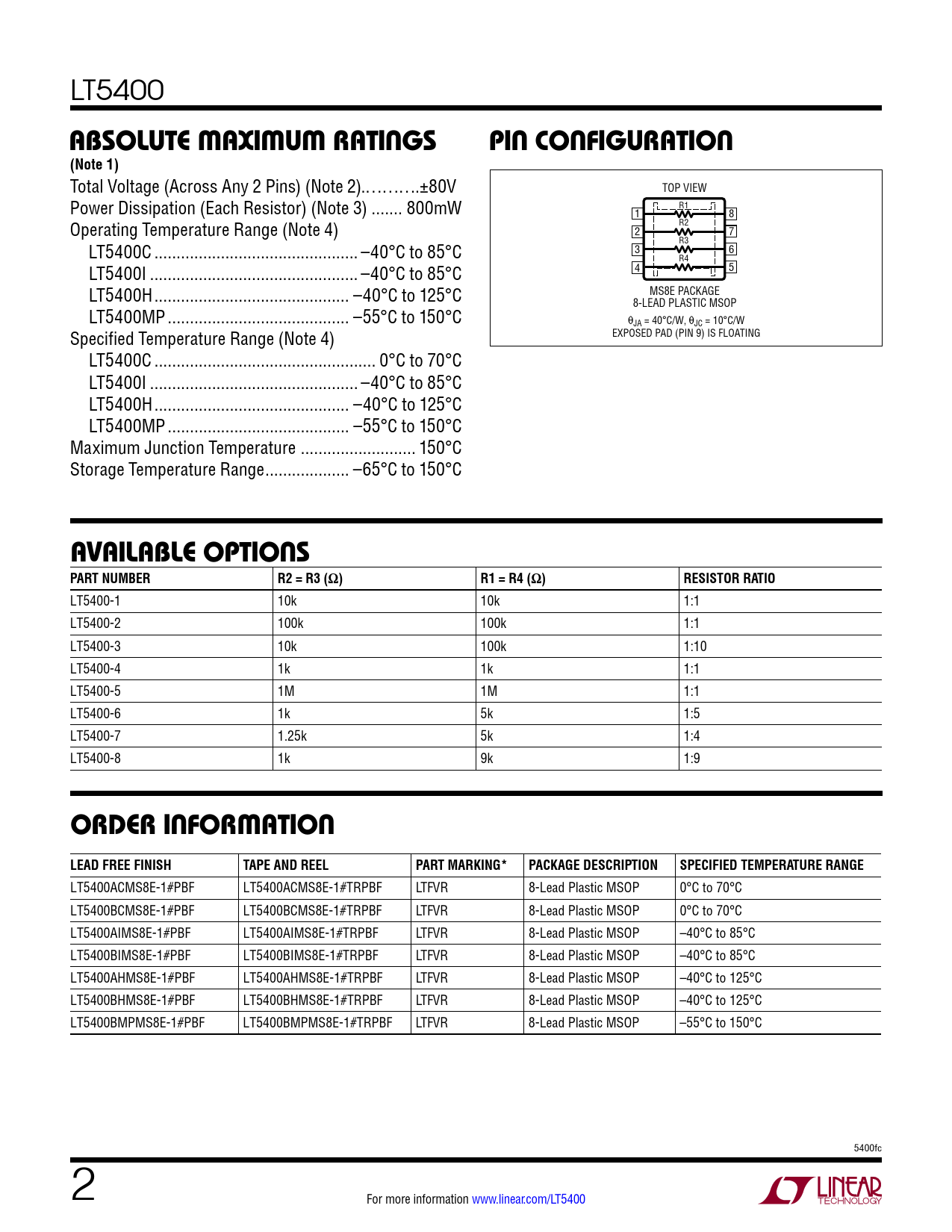 LT5400ACMS8E-1#PBF LT5400ACMS8E-1#TRPBF LTFVR 8-Lead Plastic MSOP 0°C to 70°C LT5400BCMS8E-1#PBF LT5400BCMS8E-1#TRPBF LTFVR 8-Lead Plastic MSOP 0°C to 70°C LT5400AIMS8E-1#PBF LT5400AIMS8E-1#TRPBF LTFVR 8-Lead Plastic MSOP –40°C to 85°C LT5400BIMS8E-1#PBF LT5400BIMS8E-1#TRPBF LTFVR 8-Lead Plastic MSOP –40°C to 85°C LT5400AHMS8E-1#PBF LT5400AHMS8E-1#TRPBF LTFVR 8-Lead Plastic MSOP –40°C to 125°C LT5400BHMS8E-1#PBF LT5400BHMS8E-1#TRPBF LTFVR 8-Lead Plastic MSOP –40°C to 125°C LT5400BMPMS8E-1#PBF LT5400BMPMS8E-1#TRPBF LTFVR 8-Lead Plastic MSOP –55°C to 150°C 5400fc 2 For more information www.linear.com/LT5400 Document Outline Features Applications Description Typical Application Absolute Maximum Ratings Pin Configuration Available Options Order Information Electrical Characteristics Typical Performance Characteristics Applications Information Typical Applications Package Description Revision History Typical Application Related Parts