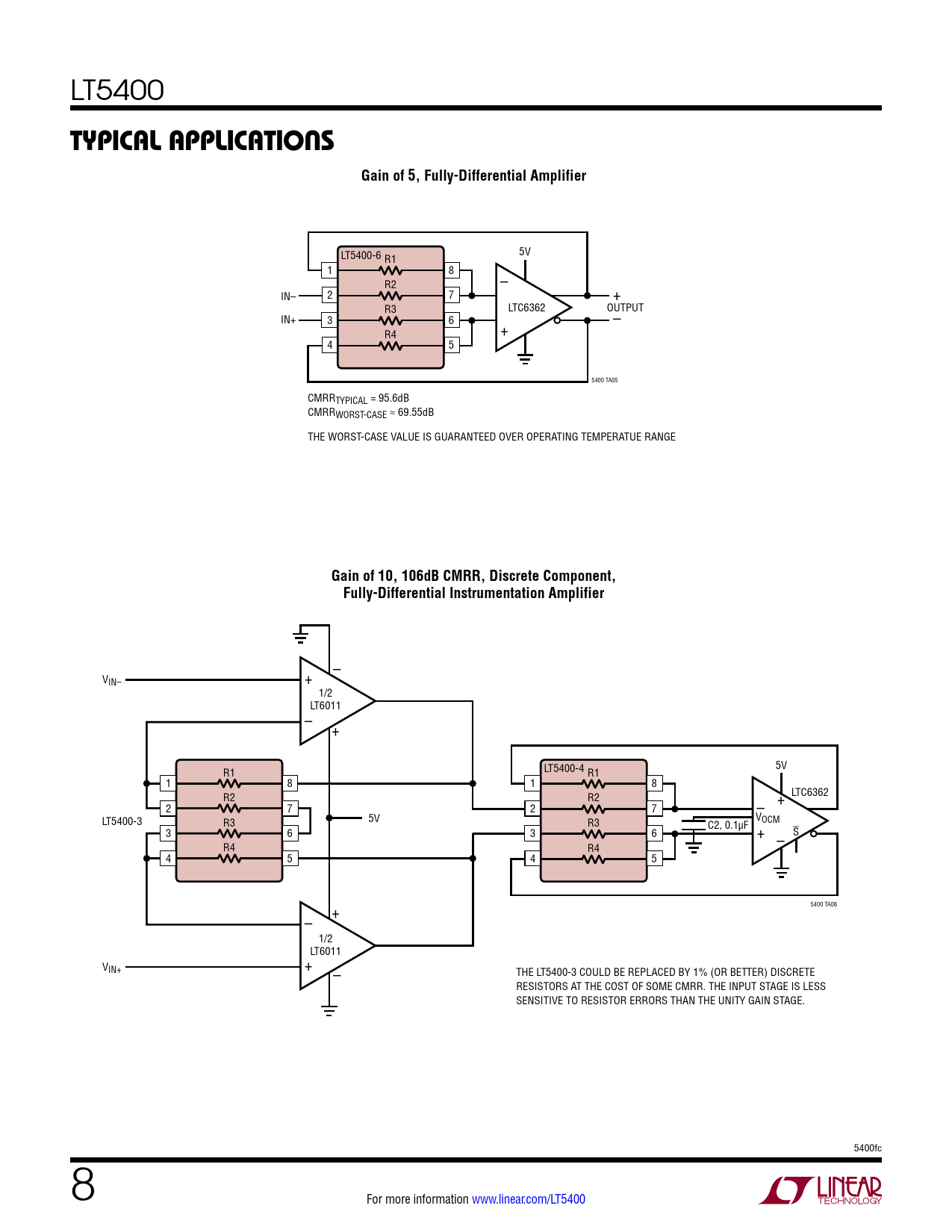 LT5400-6 5V R1 1 8 – R2 IN– 2 7 + R3 LTC6362 OUTPUT IN+ 3 6 + – R4 4 5 5400 TA05 CMRRTYPICAL = 95.6dB CMRRWORST-CASE ≈ 69.55dB THE WORST-CASE VALUE IS GUARANTEED OVER OPERATING TEMPERATUE RANGE