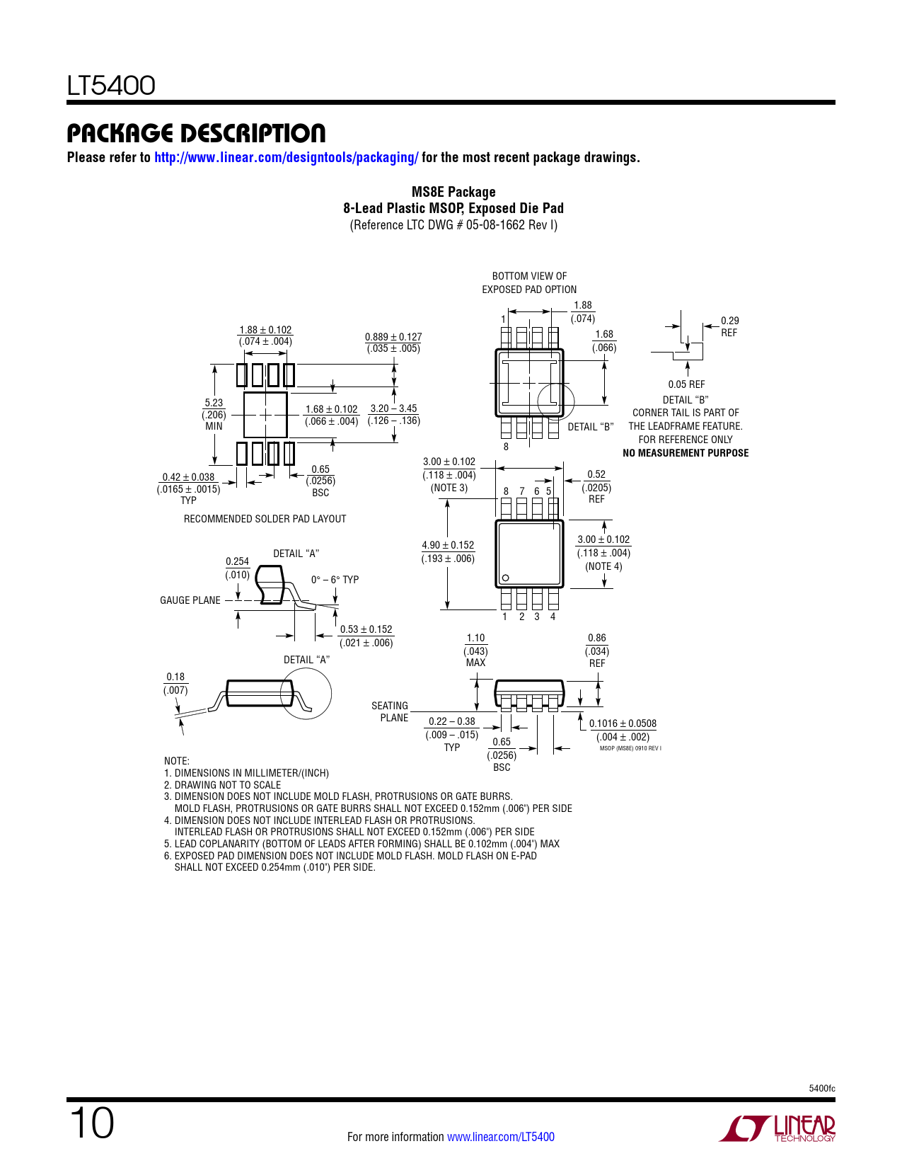 LT5400 package DescripTionPlease refer to http://www.linear.com/designtools/packaging/ for the most recent package drawings.MS8E Package8-Lead Plastic MSOP, Exposed Die Pad (Reference LTC DWG # 05-08-1662 Rev I) BOTTOM VIEW OF EXPOSED PAD OPTION 1.88 1 (.074) 0.29 1.88 ± 0.102 1.68 REF (.074 ± .004) 0.889 ± 0.127 (.035 ± .005) (.066) 0.05 REF 5.23 DETAIL “B” (.206) 1.68 ± 0.102 3.20 – 3.45 CORNER TAIL IS PART OF MIN (.066 ± .004) (.126 – .136) DETAIL “B” THE LEADFRAME FEATURE. FOR REFERENCE ONLY 8 NO MEASUREMENT PURPOSE 3.00 ± 0.102 0.65 0.42 (.118 ± 0.038 ± .004) 0.52 (.0256) (.0165 ± .0015) (NOTE 3) BSC 8 7 6 5 (.0205) TYP REF RECOMMENDED SOLDER PAD LAYOUT 4.90 ± 0.152 3.00 ± 0.102 DETAIL “A” (.118 ± .004) 0.254 (.193 ± .006) (NOTE 4) (.010) 0° – 6° TYP GAUGE PLANE 1 2 3 4 0.53 ± 0.152 (.021 ± .006) 1.10 0.86 (.043) (.034) DETAIL “A” MAX REF 0.18 (.007) SEATING PLANE 0.22 – 0.38 0.1016 ± 0.0508 (.009 – .015) (.004 ± .002) TYP 0.65 MSOP (MS8E) 0910 REV I NOTE: (.0256) 1. DIMENSIONS IN MILLIMETER/(INCH) BSC 2. DRAWING NOT TO SCALE 3. DIMENSION DOES NOT INCLUDE MOLD FLASH, PROTRUSIONS OR GATE BURRS. MOLD FLASH, PROTRUSIONS OR GATE BURRS SHALL NOT EXCEED 0.152mm (.006") PER SIDE 4. DIMENSION DOES NOT INCLUDE INTERLEAD FLASH OR PROTRUSIONS. INTERLEAD FLASH OR PROTRUSIONS SHALL NOT EXCEED 0.152mm (.006") PER SIDE 5. LEAD COPLANARITY (BOTTOM OF LEADS AFTER FORMING) SHALL BE 0.102mm (.004") MAX 6. EXPOSED PAD DIMENSION DOES NOT INCLUDE MOLD FLASH. MOLD FLASH ON E-PAD SHALL NOT EXCEED 0.254mm (.010") PER SIDE. 5400fc 10 For more information www.linear.com/LT5400 Document Outline Features Applications Description Typical Application Absolute Maximum Ratings Pin Configuration Available Options Order Information Electrical Characteristics Typical Performance Characteristics Applications Information Typical Applications Package Description Revision History Typical Application Related Parts